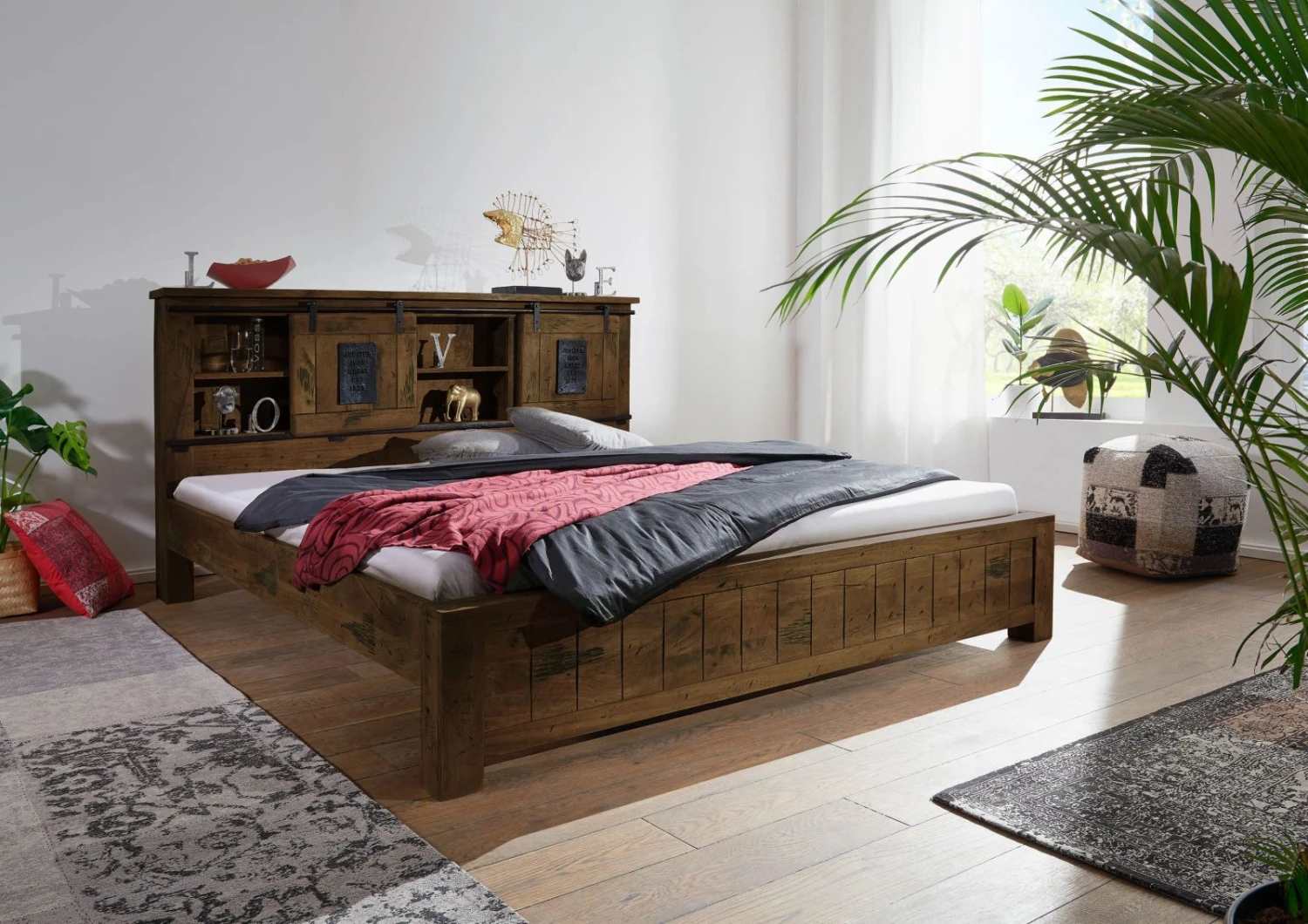 questo letto matrimoniale 180×200 cattura lo sguardo non solo per il materiale utilizzato. Ad aggiungere un tocco di fascino industriale al mobile è la testiera, dotata di ante scorrevoli decorate con elementi in ferro scuro. Le ante celano pratici ripiani su cui riporre libri, fazzoletti o soprammobili.