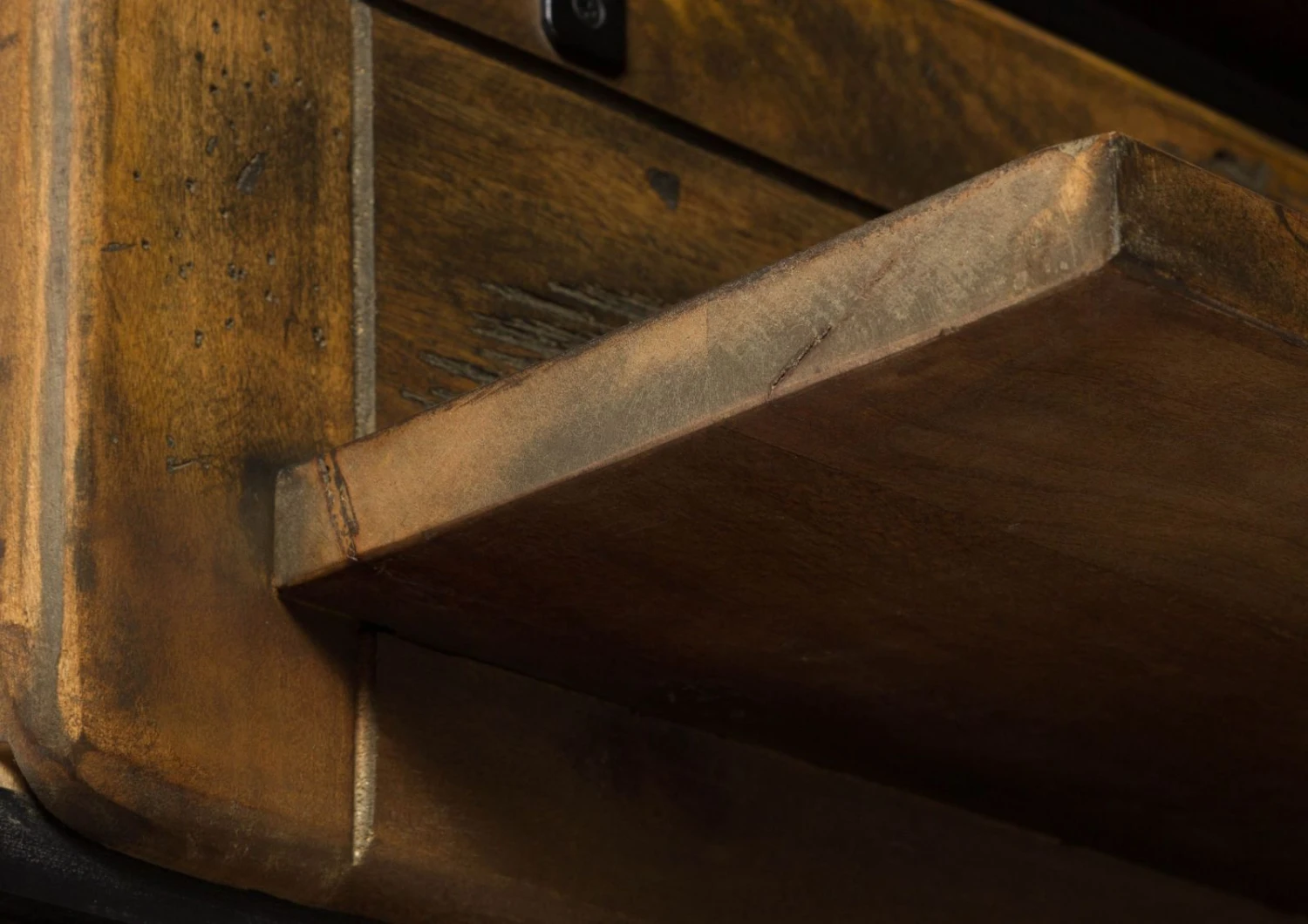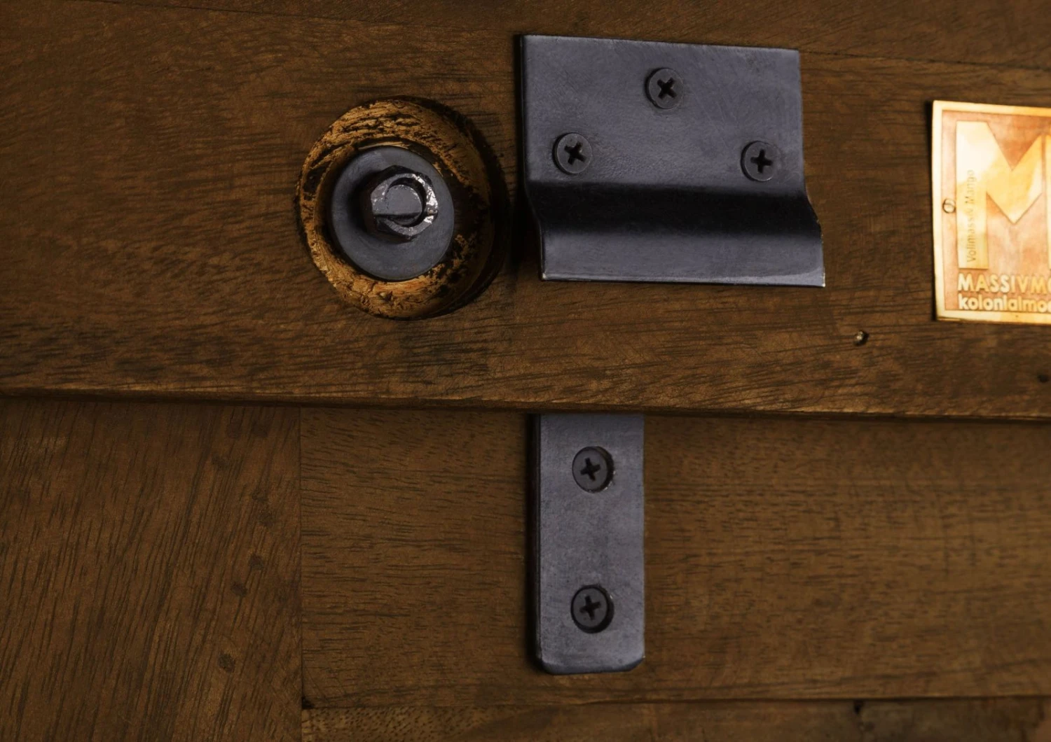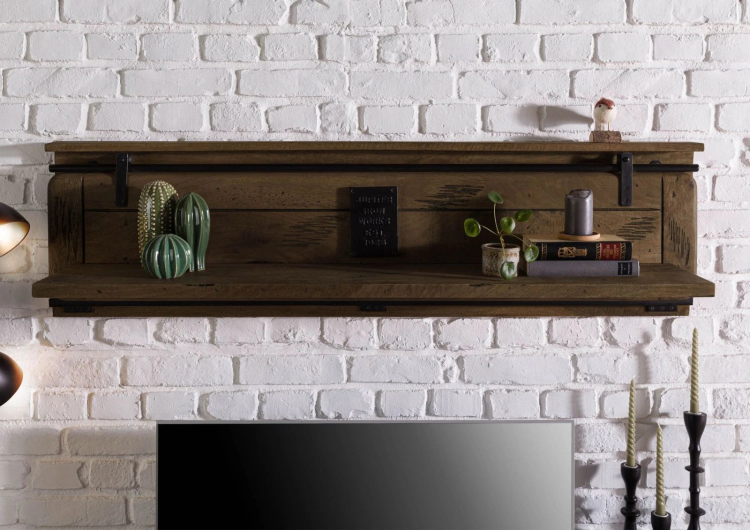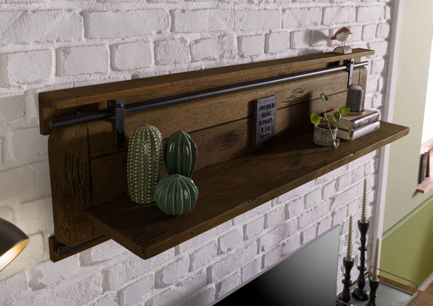 Il punto forte di questa mensola moderna è la speciale finitura del legno di mango massiccio: ulteriori fessure e intagli sottolineano le caratteristiche naturali del materiale e creano una texture interessante. In questo modo, il legno s’integra con i dettagli in metallo e la mensola diventa un posto speciale sulla parete.
