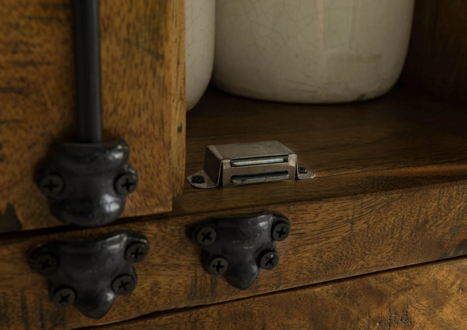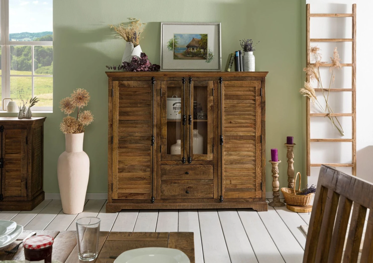 Cuore pulsante della madia sono le ante a vetrina. Non solo perché stanno esattamente al centro, ma anche perché completano con eleganza la scelta dei materiali. Dietro la vetrina si possono esporre piatti e tazze, accessori e libri. Rifiniscono il rustico quadro in stile francese reinterpretato piccoli catenacci e maniglie tutti in metallo, in una compiuta fusione di materiali.