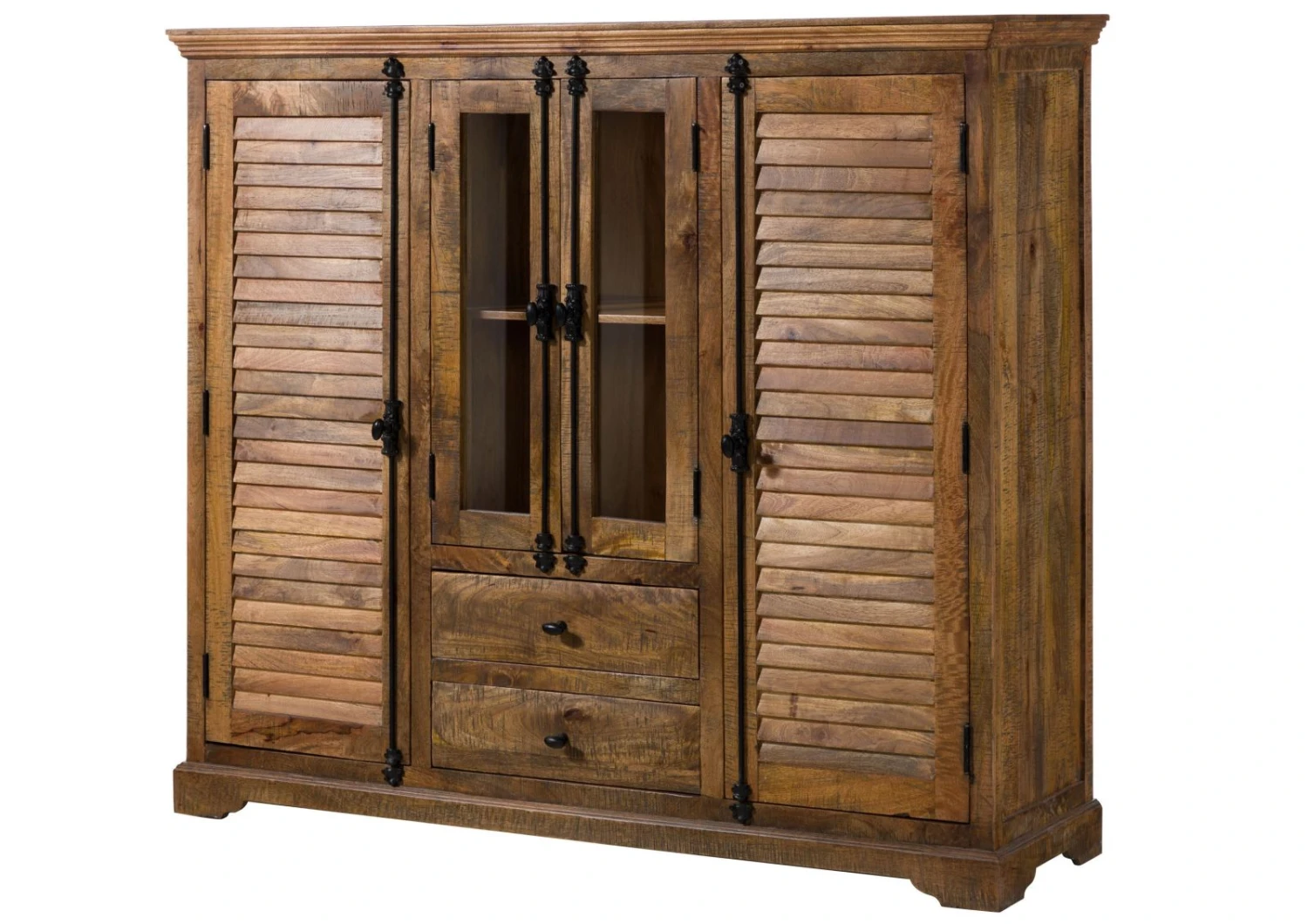 Stile rustico non significa necessariamente colore bianco, e questa madia in massello di mango marrone ne è una suggestiva dimostrazione. La finitura laccata scura dona al mobile un carattere rustico, esaltando e lasciando trasparire la natura della materia prima. Animato da nodi, sfumature cromatiche e una grezza finitura a colpi di pialla, il mobile è l’emblema di uno stile di vita d’ispirazione country. Le ante a lamelle ai lati sottolineano il look alla francese.