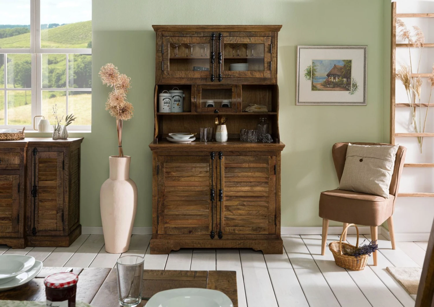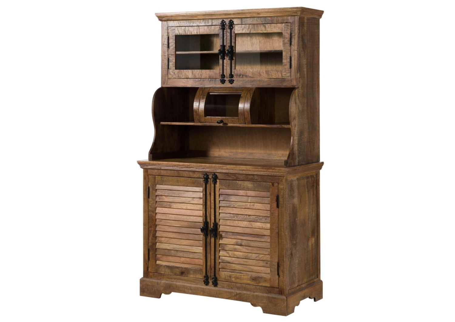 Questo mobile con ante a lamelle realizzato in legno di mango richiama l’atmosfera delle campagne francesi. Due piccole ante a vetrina, la pratica ribalta e due vani a giorno offrono spazio a volontà per stoviglie, provviste, ecc. Due ante a lamelle nella parte inferiore celano due ulteriori ripiani interni.
