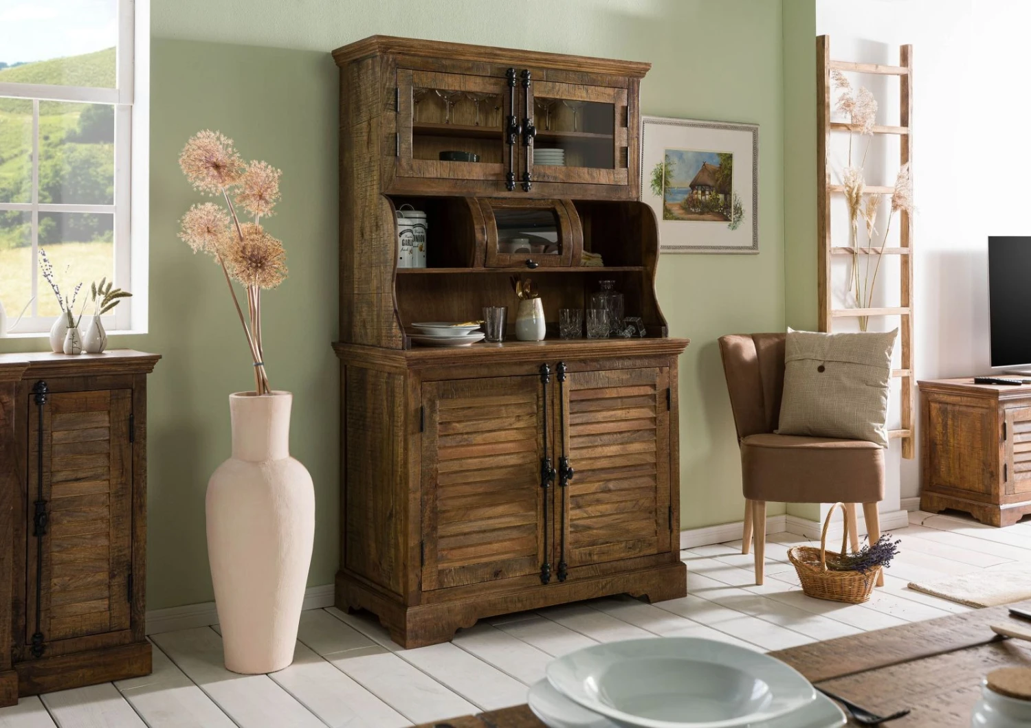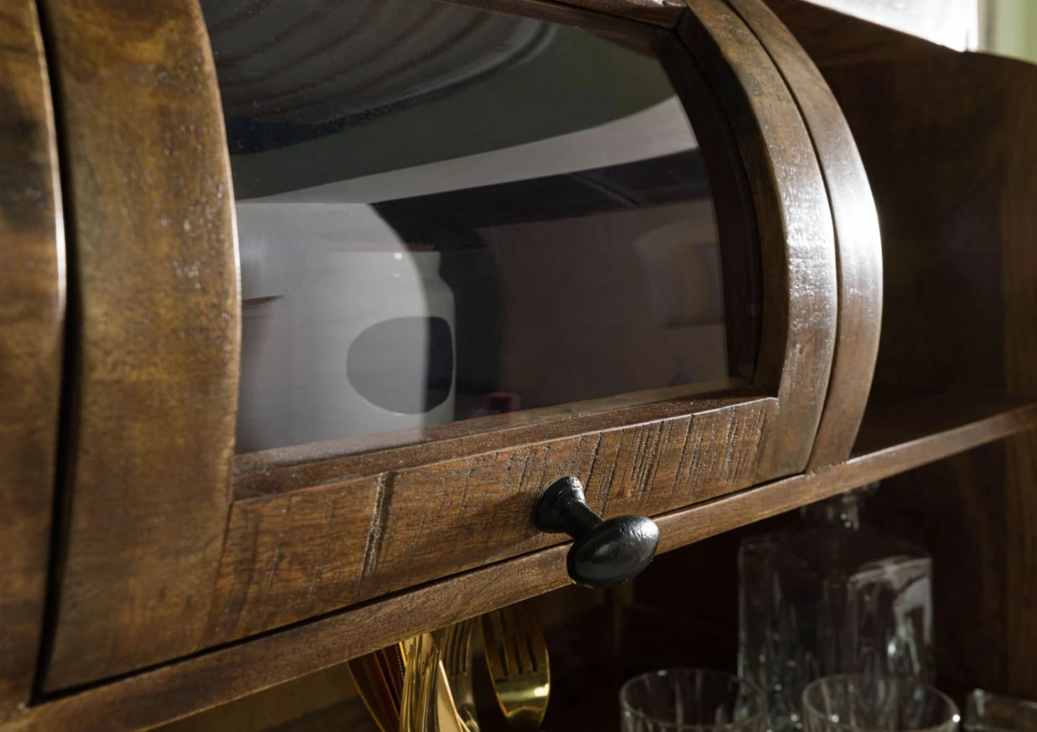 - Suadente accostamento tra pregiato legno di mango e raffinate ante a vetrina