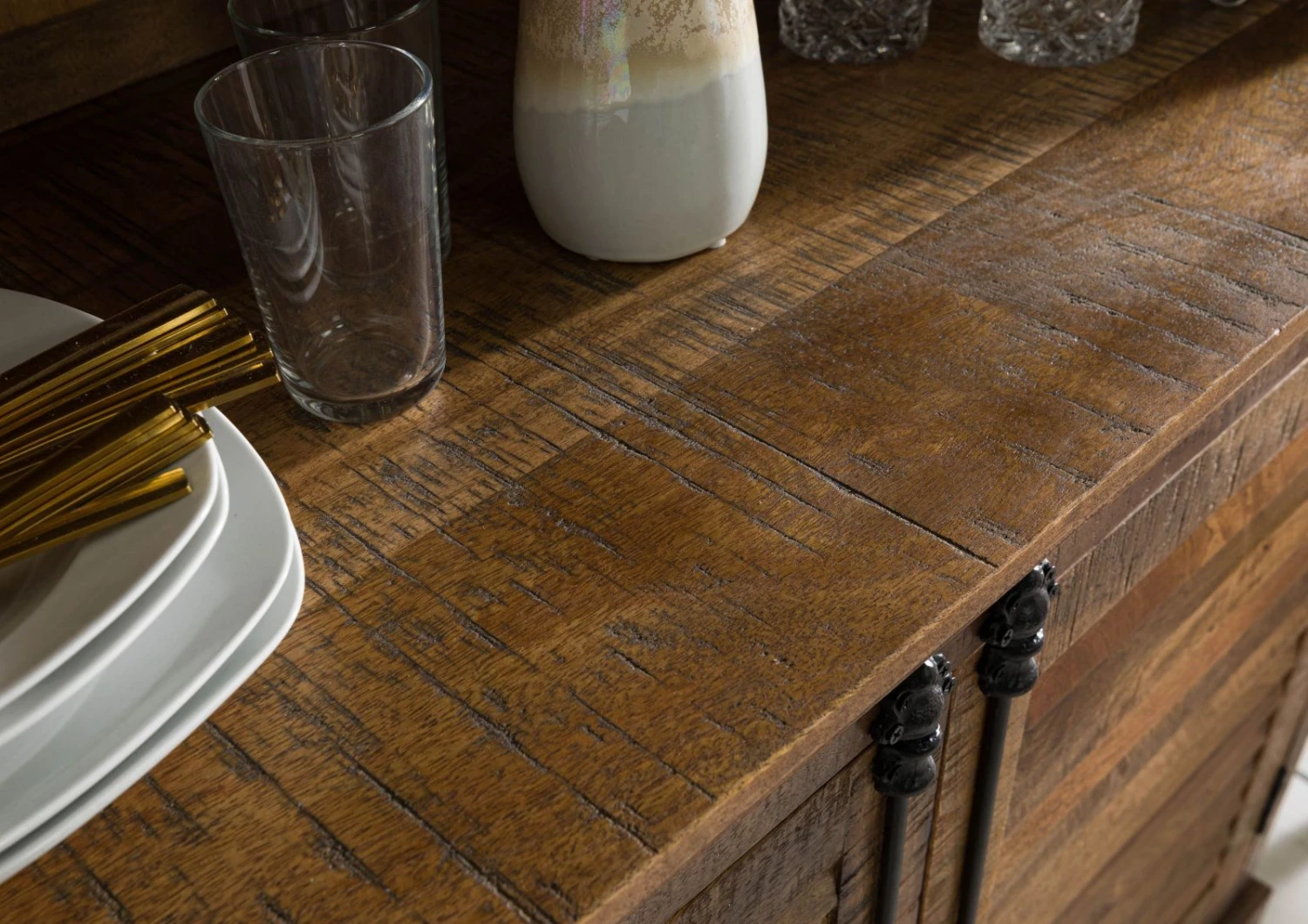 La composizione estetica è di grande effetto: grazie a maniglie ed elementi decorativi in metallo scuro, al profilo ondulato del modulo centrale e alla suggestiva venatura del legno massello cattura l’attenzione emanando fascino e calore. Il pezzo forte sono naturalmente le ante a lamelle in stile rustico francese.
