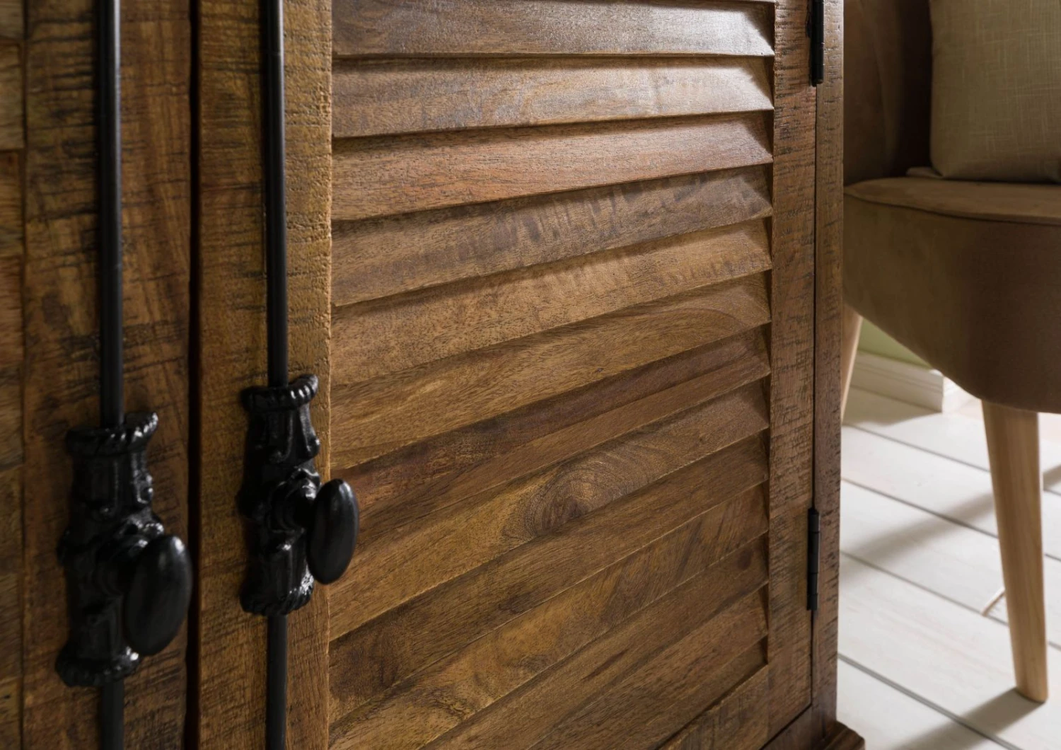 - Mobile dispensa in stile rustico con ante a lamelle realizzato in legno di mango