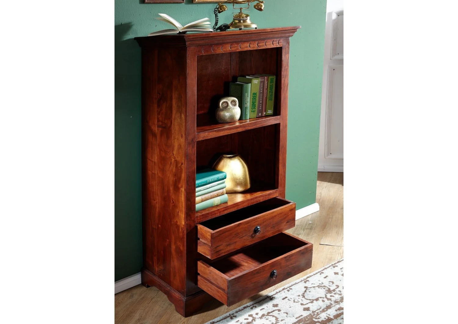 Per mostrare i tuoi libri più belli o altri elementi decorativi, questa scaffalle / libreria in stile coloniale troverà il suo posto in una biblioteca, in un ufficio o anche in un salotto. Le sua finiture laccata e la tonalità marrone daranno un tocco caldo e amichevole alla tua stanza. I suoi scaffali ti permetteranno ad esempio di esporre i tuoi libri più belli e altri oggetti decorativi, mentre i suoi due cassetti saranno l’ideale per riporre le tue cose lontano dalla polvere. Il suo design elegante ti ispira? Sentiti libero di scoprire il resto della nostra collezione di mobili OXFORD perfettamente compatibile con il design di questo scaffale.
