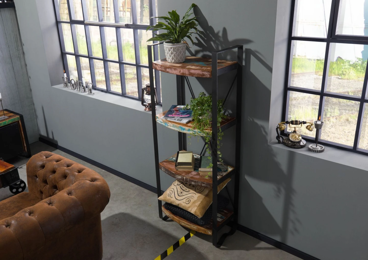 Questo scaffale offre una scelta insolita di materiali e un design esclusivo, creando un mobile particolare. Lo scaffale sarà ideale per arredare uno spazio non occupato in un ingresso o in un soggiorno. Il punto forte di questa serie di mobili deriva dalle forme artistiche e dai raffinati dettagli disegnati con creatività, tanto da rendere questo pezzo realmente particolare. Gli appassionati di mobili riciclati troveranno nell’offerta di questa linea di arredamento un elevato numero di mobili che si adattano bene ad essere combinati in maniera efficace a questo scaffale. Lo scaffale si distingue per l’efficace combinazione di ferro e legno riciclato. Le gambe sono costruite con del ferro nero massiccio.Il corpo del mobile, di legno riciclato presenta una scelta di materiale che è insuperabile per originalità nell’intero settore dell’arredamento.