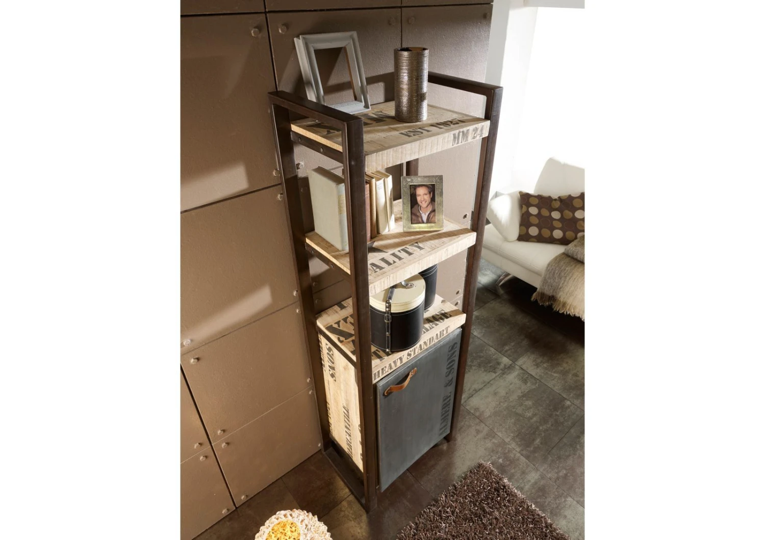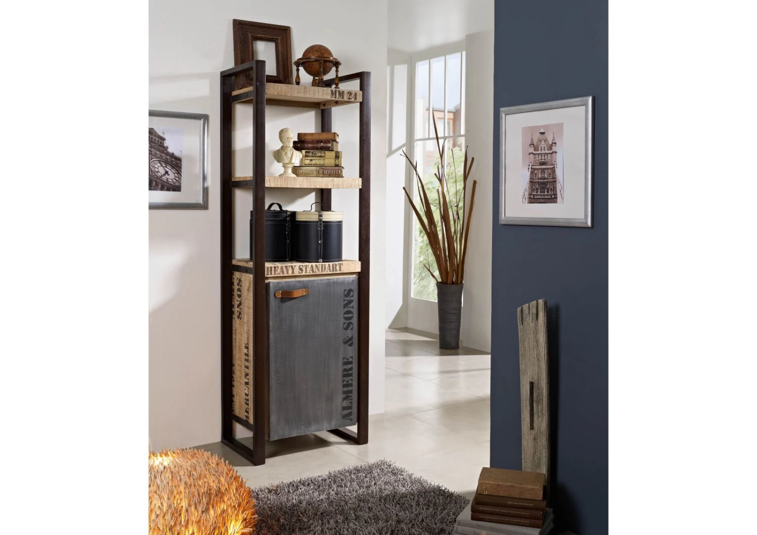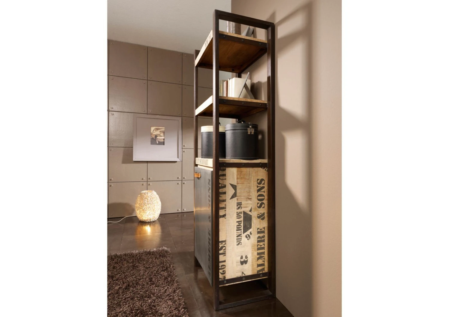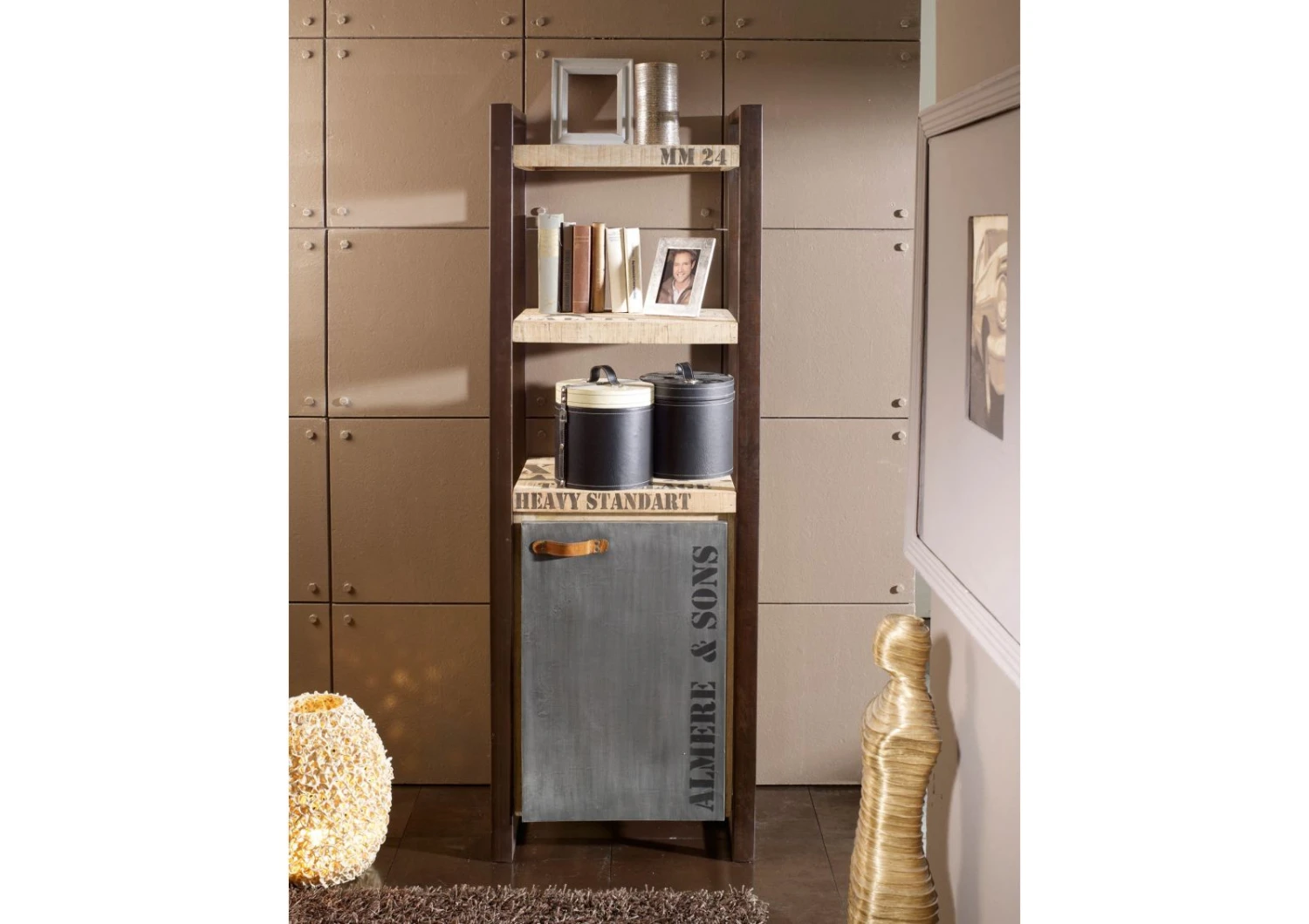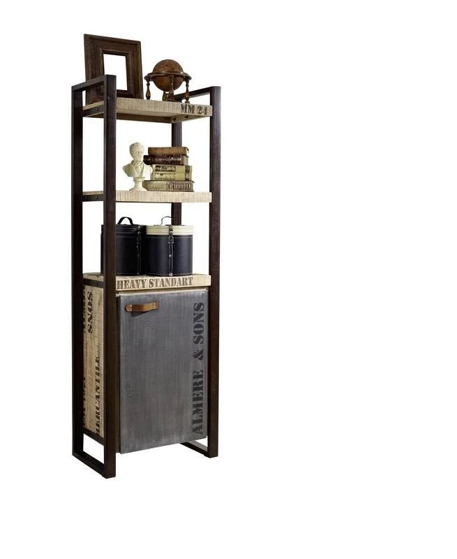 Scaffale in legno massello di mango color sabbia con nuance marrone chiaro. Una caratteristica lavorazione del materiale ad effetto grezzo regala un piacevole impatto visivo. I caratteri marchiati a fuoco, le sfumature sbiadite, laspetto vissuto e la commistione dellelemento naturale delle travi con il metallo del telaio, sono tutti indizi distintivi dello stile industriale. Lo scaffale in legno massello presenta un totale di tre mensole, lultima delle quali è il ripiano superiore di un vano di archiviazione con due scomparti e sportello ad anta. La maniglia dello sportello è in pregiato cuoio, attaccato ad una placca decorativa di ferro con rivetti a testa tonda. Compatto e di dimensioni contenute, larredo si presta ad essere collocato in cucina o in soggiorno, sfruttando i piccoli angoli e recuperando prezioso spazio per uso quotidiano o anche solo ornamentale.