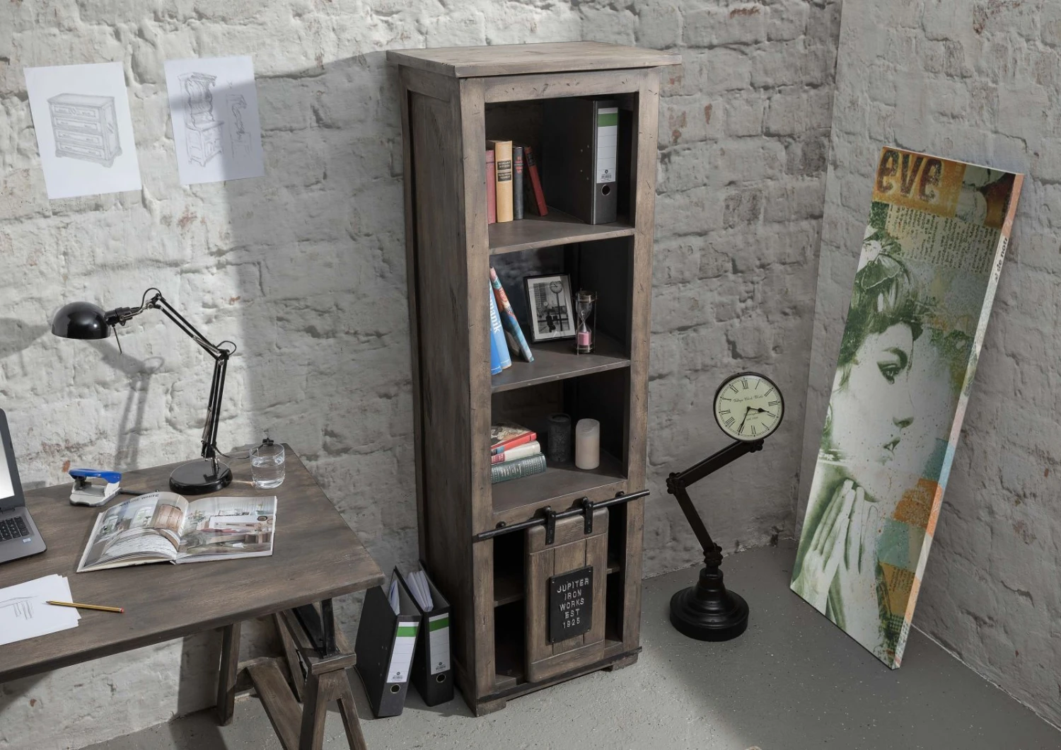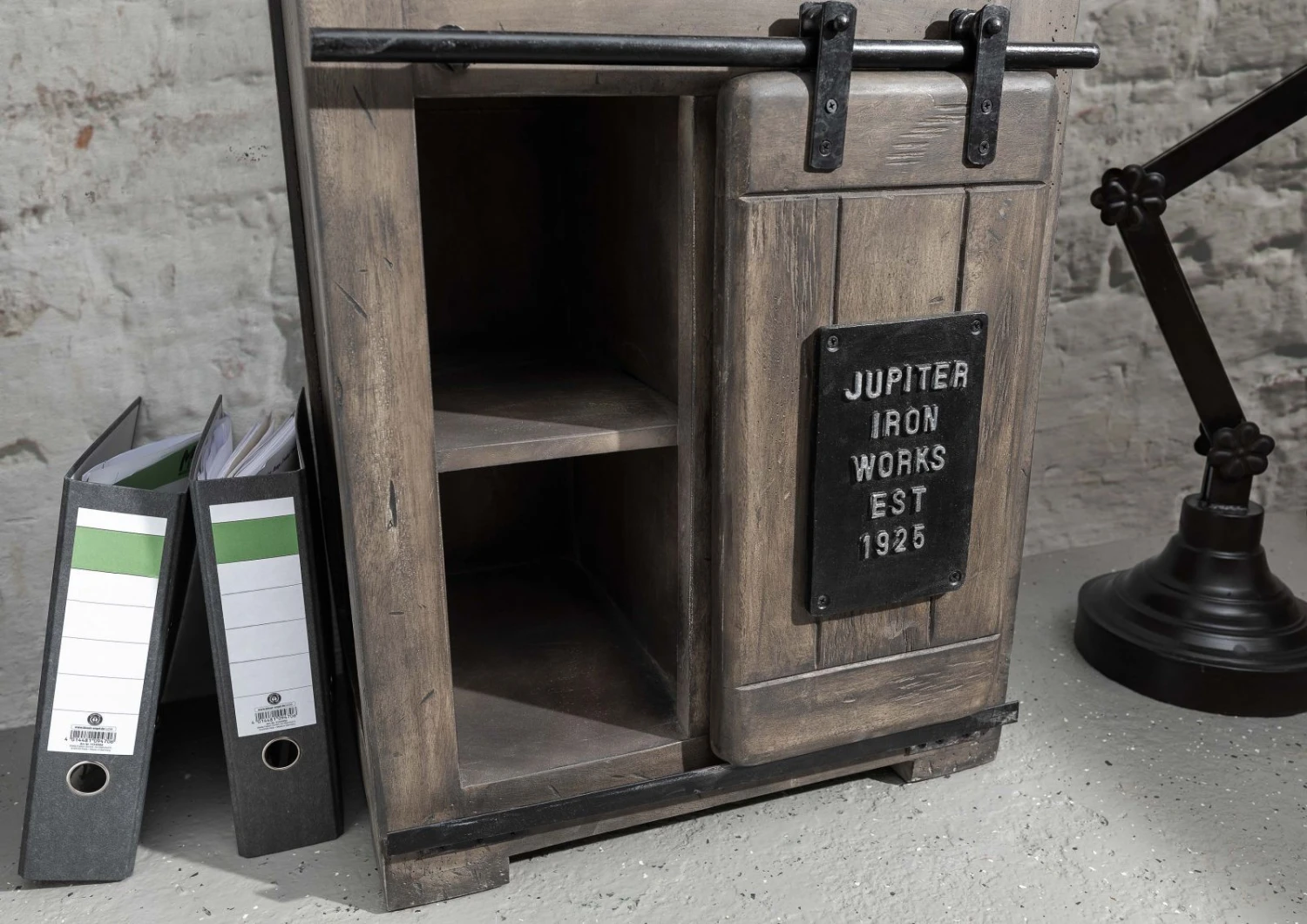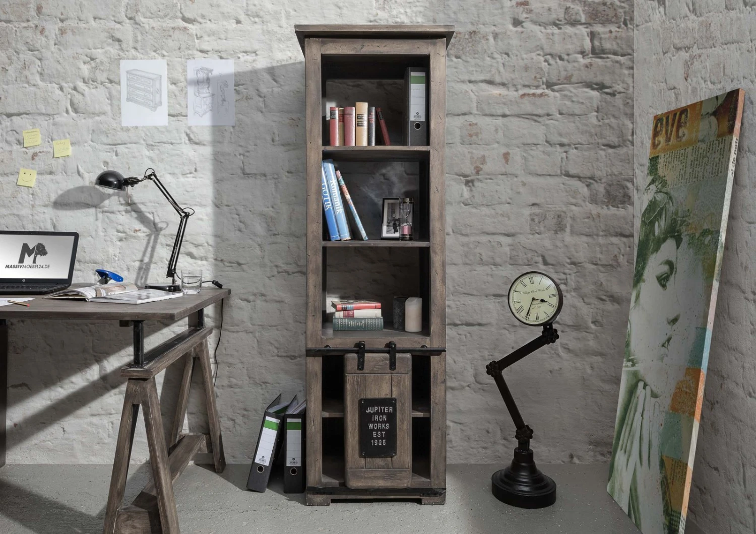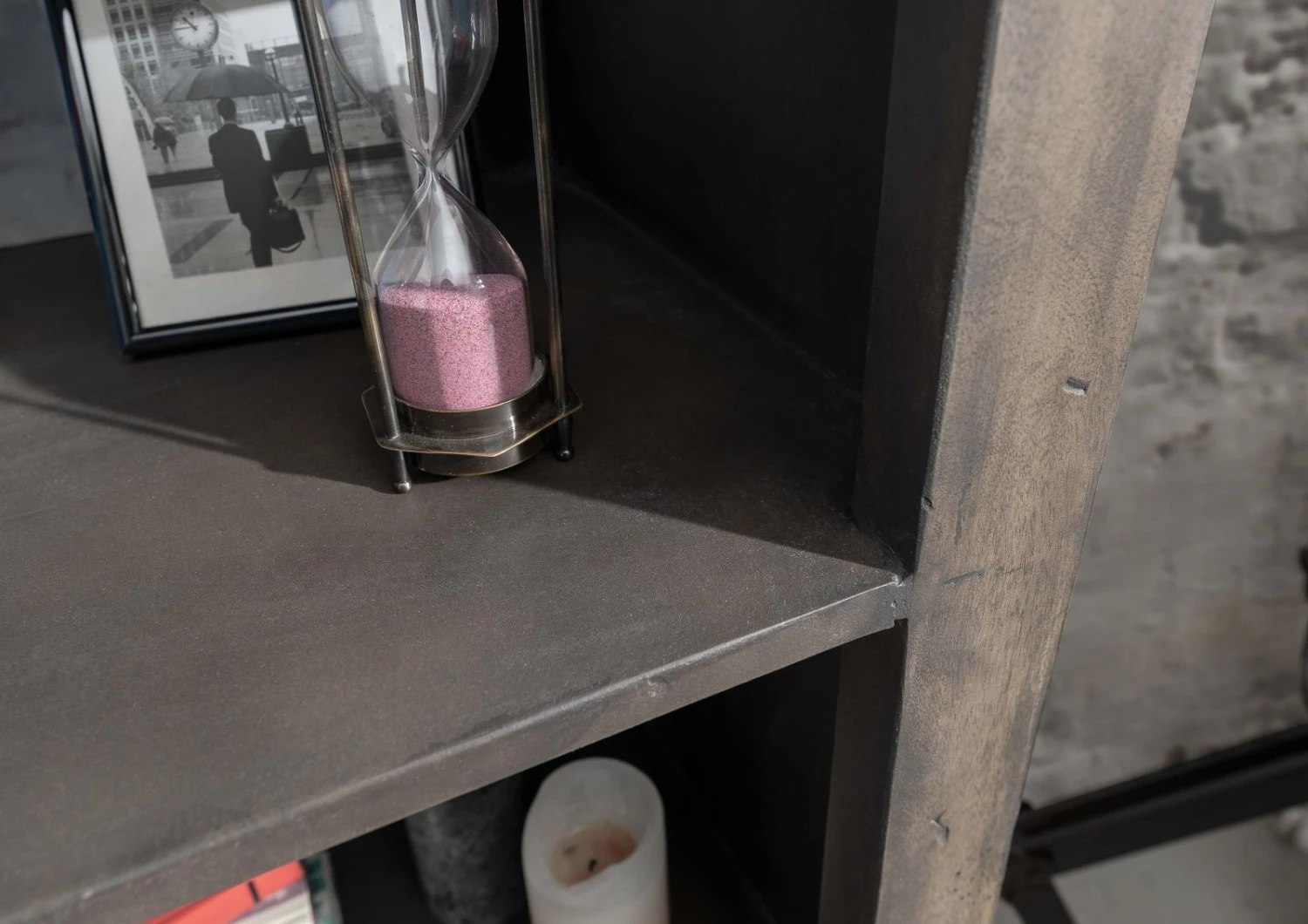 Mobile libreria in legno massello di mango, soffice colore grigio nelle sfumature cromatiche e venature del legno naturale. La superficie sottoposta a laccatura esalta le autentiche discromie e imperfezioni del materiale. Lelemento può essere diviso in due sezioni, con tre vani aperti nella parte superiore, ricavati grazie a due mensole. In basso è presente il dettaglio distintivo di questo mobile libreria in legno massello. Si tratta di altri due scomparti contenitori delimitati da un ripiano centrale, con inserti in ferro battuto. Attraverso le barre metalliche scorre un pannello decorativo arricchito da una borchia incisa. Il concept e i dettagli contribuiscono a fondere lo industrial con quello coloniale, ottenendo un magnifico risultato estetico.