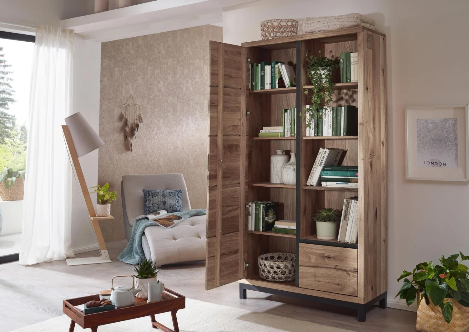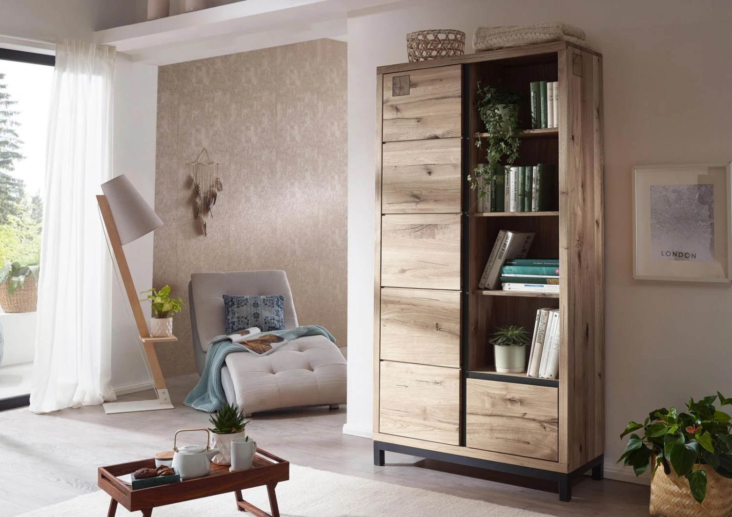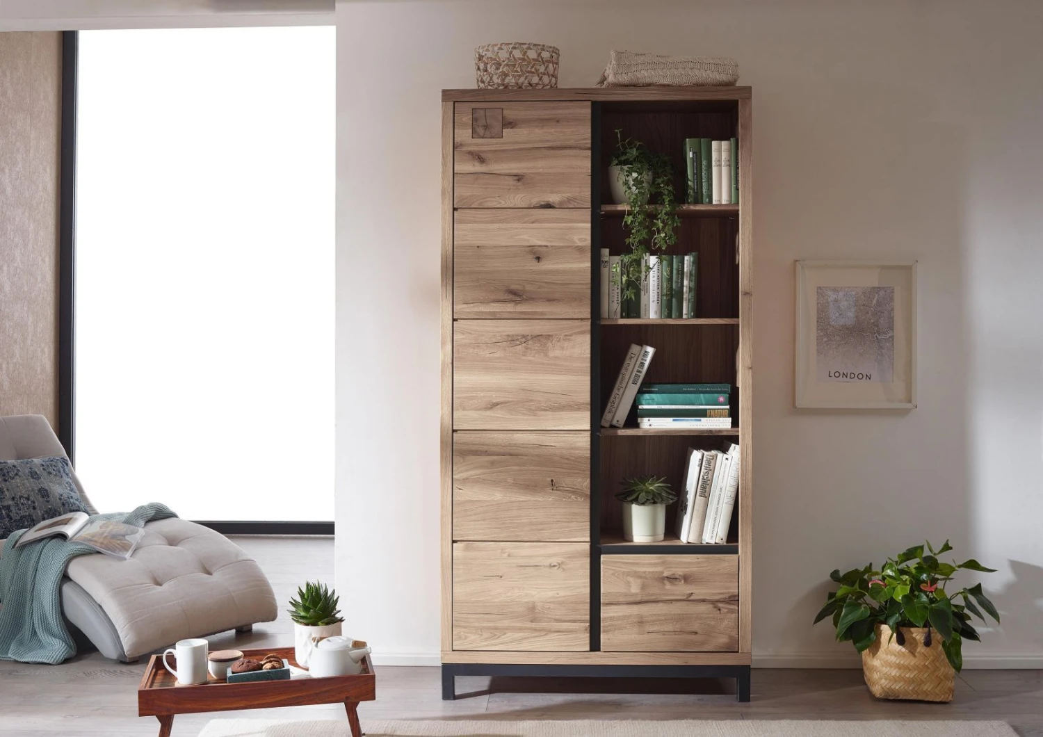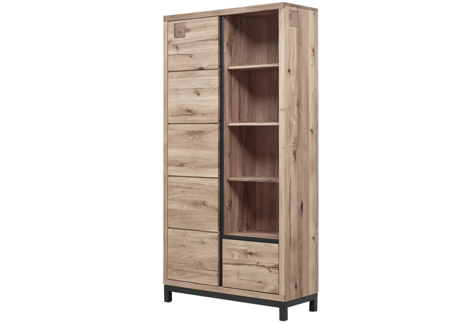 Libreria in legno massello di quercia selvatica, trattamento oliato della superficie, design moderno, ottima compattezza e solidità. La struttura fonde armoniosamente il metallo grigio satinato con il materiale naturale dellesoscheletro e dei vani di contenimento. La libreria in legno massello presenta sulla sinistra uno scomparto con sportello ad anta, sulla destra quattro ripiani aperti e in basso un singolo cassettone telescopico dotato di sistema di scorrimento fluido soft close. Il mobile non presenta maniglie ma le aperture sono tutte a gola, per mantenere continuità nelle linee e nei profili. Il componente di interior funge alloccorrenza da scaffale e può essere collocato nel salotto o nello studio..