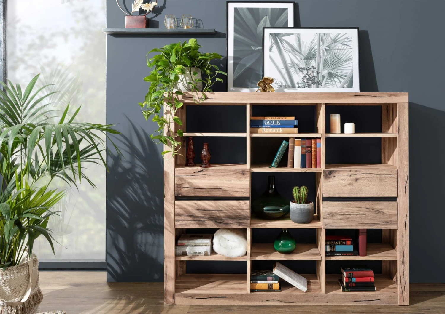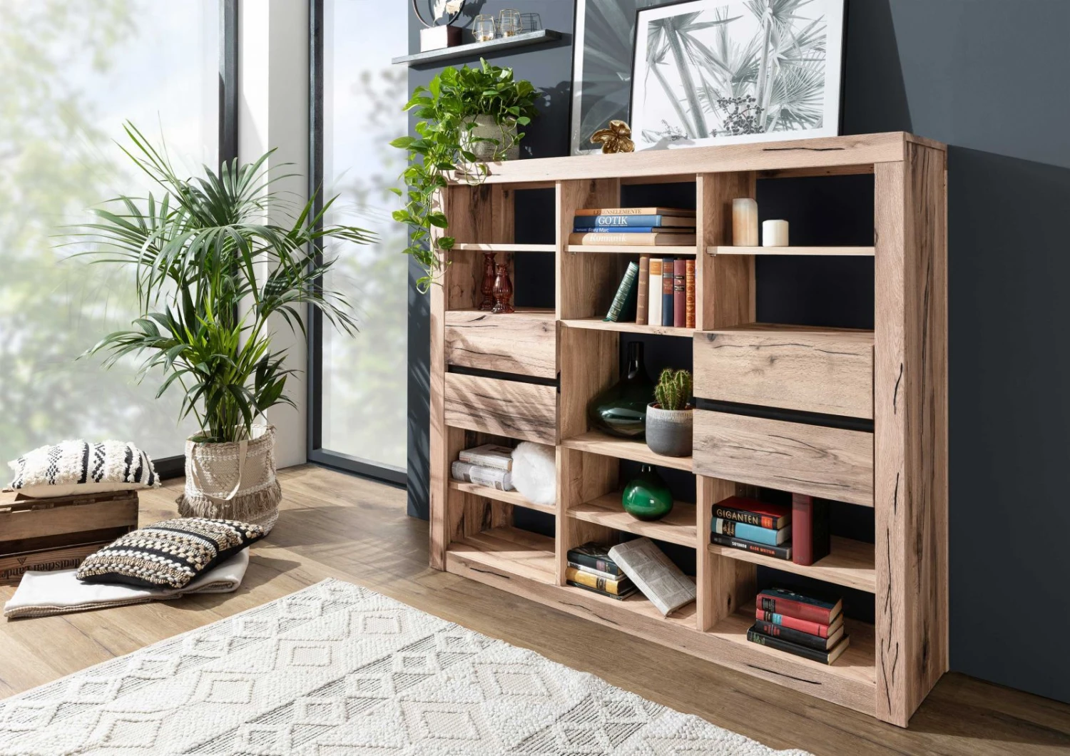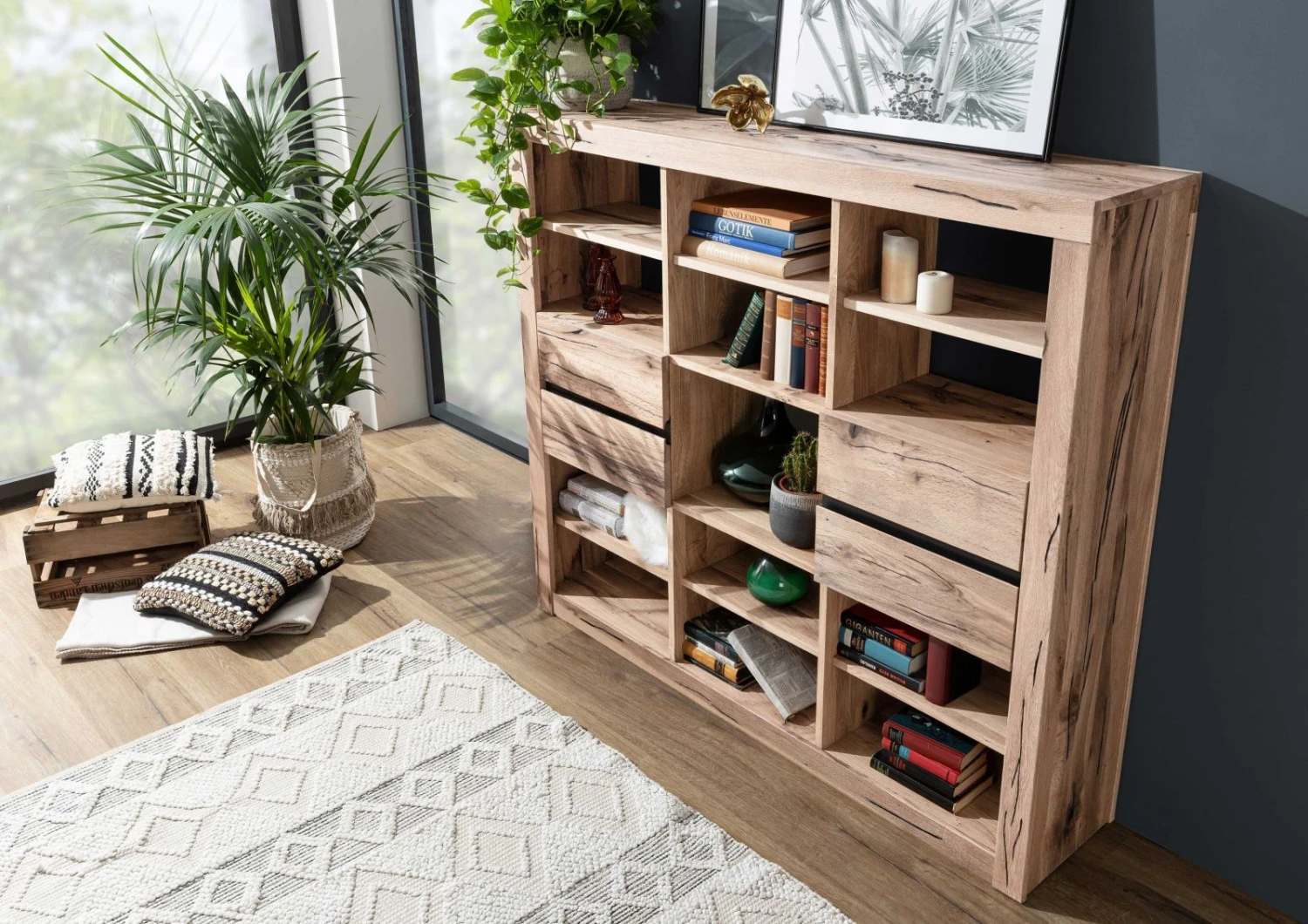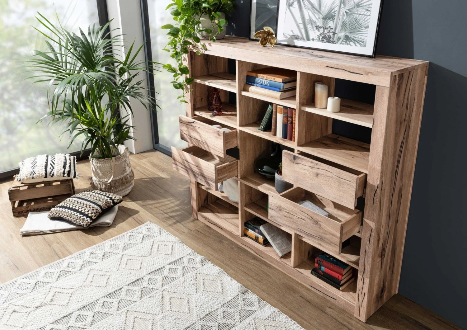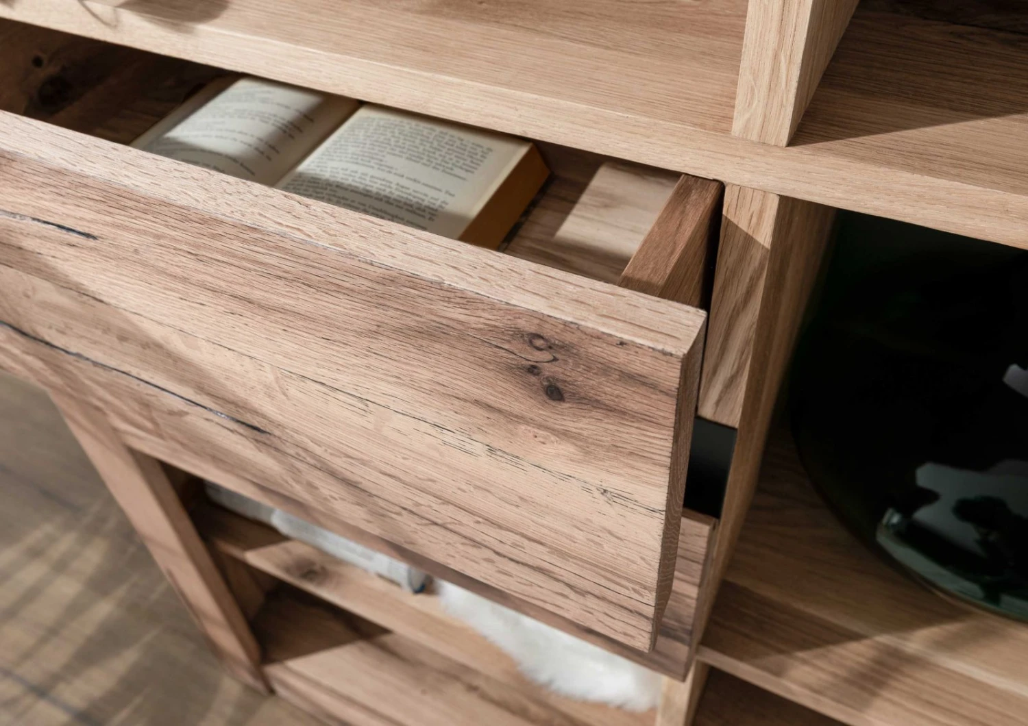 Scaffale in legno massello di cerro, stile moderno, colore bianco, lavorazione ad effetto oliato, superficie con suggestive venature ed imperfezioni naturali. Lestetica sottile, di grandi dimensioni e il design contemporaneo fanno di questo arredo un elemento di interior pratico e versatile. Il mobile con base a zoccolo chiuso presenta vari sezioni di archiviazione di cui quella superiore e inferiore constano in una eco geometrica di sei vani aperti divisi da un ripiano orizzontale. La parte centrale è invece composta da un spazio in mezzo e quattro cassetti con apertura a gola e che spezzano la monotonia visiva e rendono lo stile originale. Lo scaffale in legno massello di quercia selvatica monta il sistema soft-close per lo scorrimento fluido dei carrelli, è disponibile anche in naturale oltre che marrone/sabbia.
