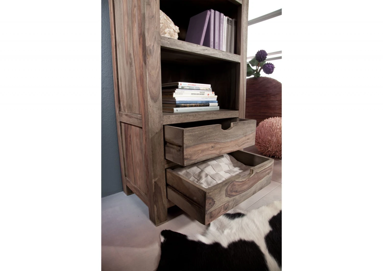 Non importa in quale stanza deciderete di mettere questo scaffale grazie alla sua struttura pratica e variabile, farà una bellissima figura ovunque e permetterà di sfruttare in maniera impeccabile lo spazio disponibile che, spesso, non è sufficiente per riporre gli oggetti che amiamo e che per noi sono necessari. Nei ripiani superiori è possibile riporre libri e riviste, mentre entrambi i cassetti nella parte inferiore potranno contenere oggetti che non si desidera esporre o di uso quotidiano. In generale, chi conserva i propri oggetti non ha mai abbastanza spazio; questo scaffale si abbina in maniera impeccabile con gli altri elementi di arredo della stessa linea. Le quattro gambe corte terminano con un semplice bordo in metallo opaco. Di questo mobile straordinario affascina il legno di Sheesham con i suoi motivi che ricordano le onde. Il colore grigio chiaro si unisce a un caldo e magnifico color rosso. Le venature di questo legno si adattano magnificamente a un design moderno, creando un’atmosfera confortevole che renderà rilassante qualsiasi ambiente. Questo scaffale si presta a diversi utilizzi e può essere abbinato a moltissimi altri mobili. Si sposa perfettamente con gli innumerevoli elementi di arredo della collezione NATURE GREY, realizzando un sistema funzionale che crea ordine e spazio.