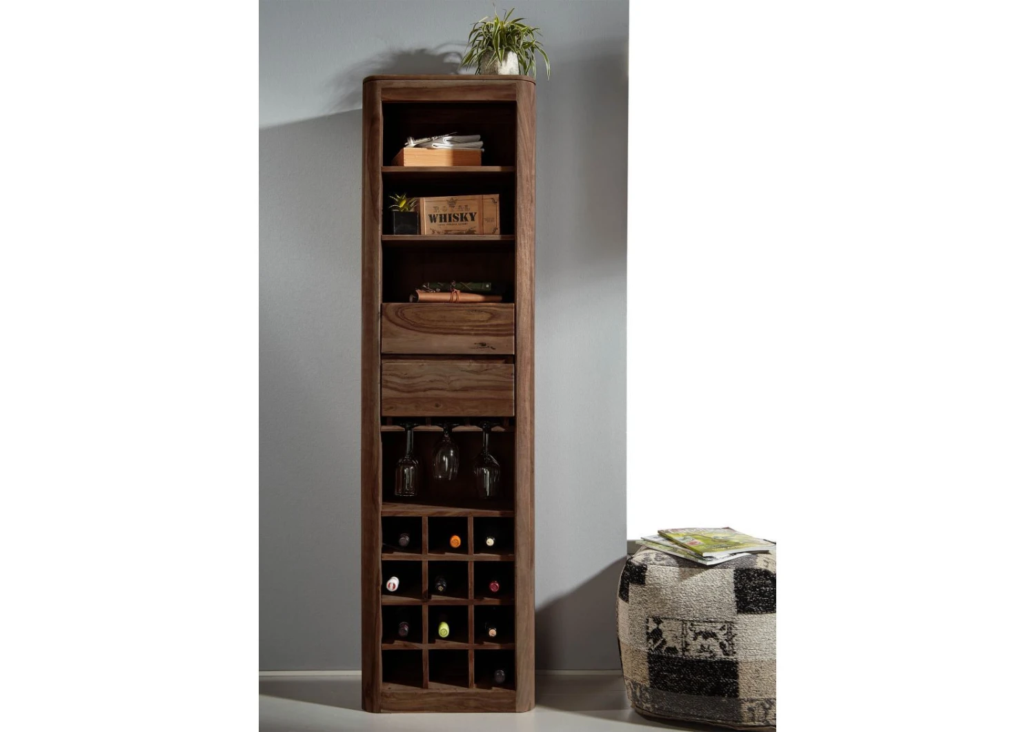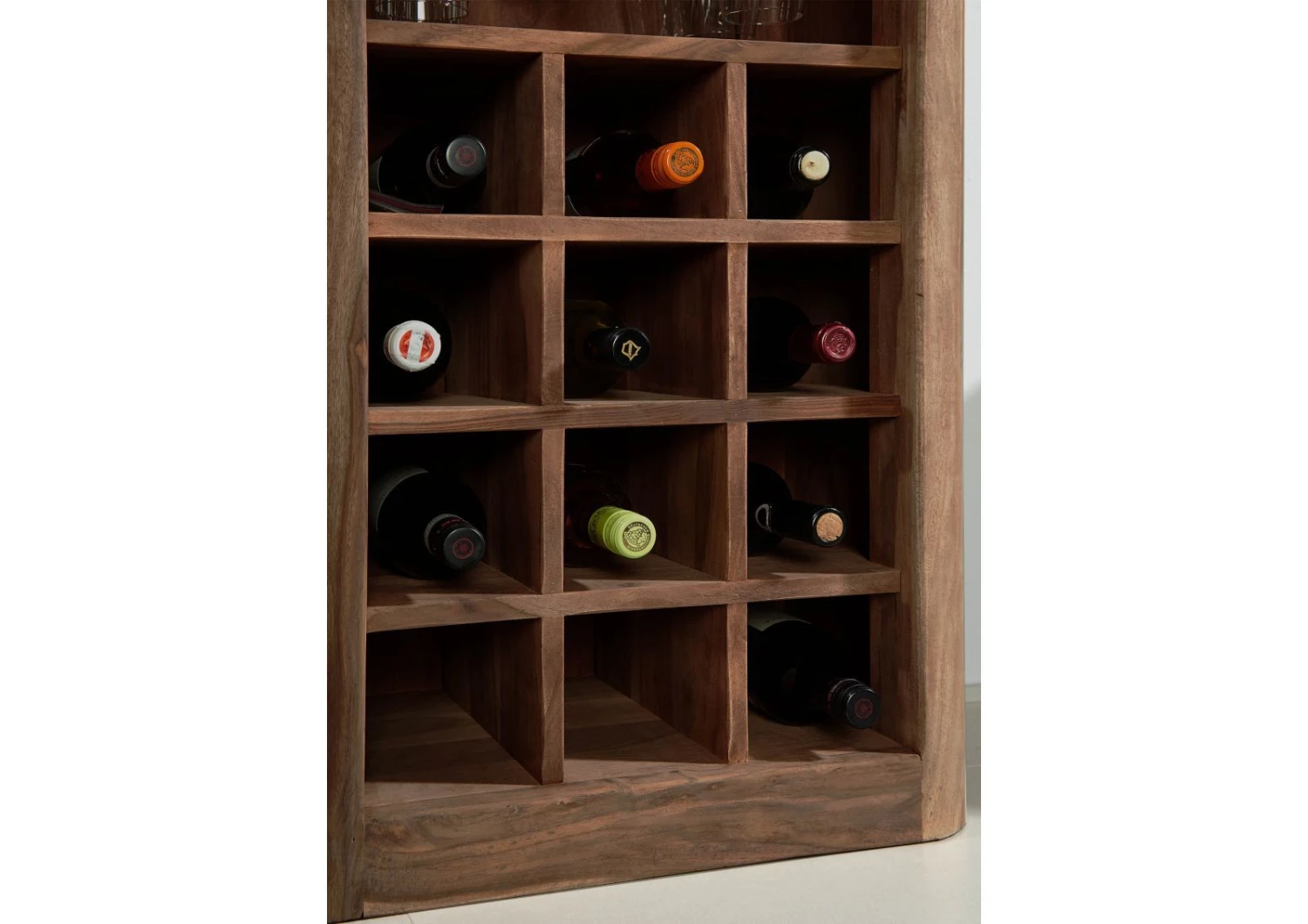 I mobili principali creano lambiente ma sono poi quelli accessori che lo definiscono. Questo mobile cantinetta in legno massello di sheesham acacia è un complemento darredo prezioso e raffinato. Sottile e discreto si fa però notare grazie alla sua estetica particolare e alla sua forma elegante. La sezione superiore è composta da tre mensole, quella inferiore da 12 vani portabottiglie e supporti per calici. Entrambe sono separate da una coppia di cassetti centrali con maniglie a gola. Lo stupendo color ciliegia affumicato immerso tra le sfumature del durame, evoca quello delle botti da vite. Il mobile cantinetta in legno massello rappresenta una straordinaria idea di interior per unire bellezza e praticità.
