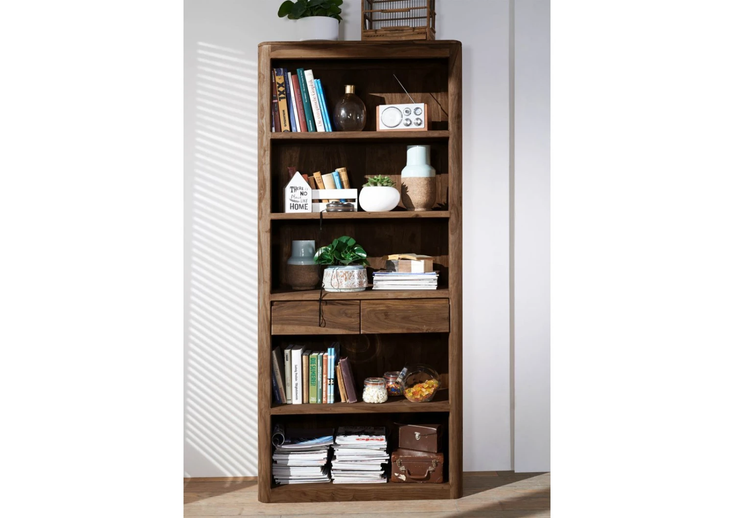 Ecco un altro esempio di fascino combinato ad una grande versatilità. Questo scaffale in legno massello di sheesham acacia della linea Toronto è una vera ispirazione per la creatività. Tre mensole superiore e due inferiori offrono spazio per libri, soprammobili ornamentali, riviste e altro ancora. Nella sezione centrale sono presenti due cassetti con maniglia a gola per riporre oggetti più piccoli. Grazie al suo stile ibrido tra rustico e contemporaneo, questo arredo può essere collocato efficacemente in più zone della casa. Perfetto in salotto, splendido in cucina, risulta adeguato anche in camera da letto o nello studio. Lo scaffale in legno massello spicca infine per un avvolgente color ciliegia affumicato, le cui autentiche discromie fungono da elemento decorativo naturale.