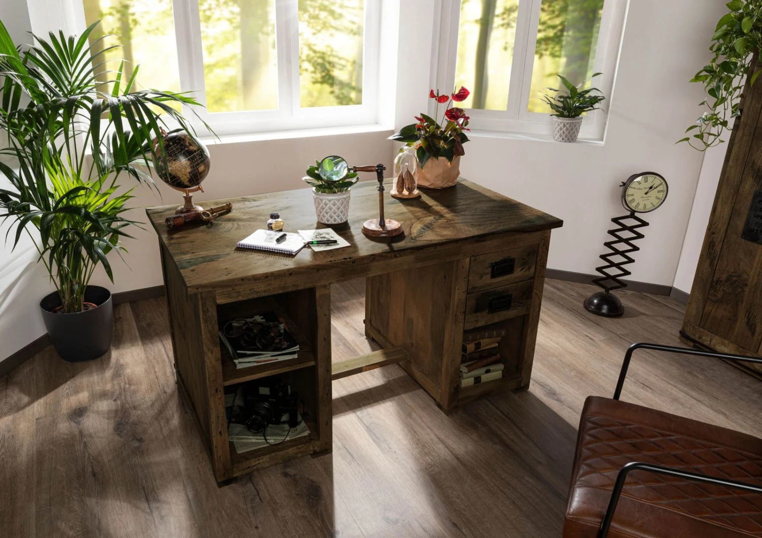 Questa scrivania in massello di mango è estremamente bella e pratica insieme. Dotata di due vani a giorno a sinistra e di due cassetti e un vano a giorno a destra, offre ampio spazio utile. Ideale per libri, utensili da scrittura e materiale per l’ufficio. Ma non è solo la capienza a farne un capolavoro: