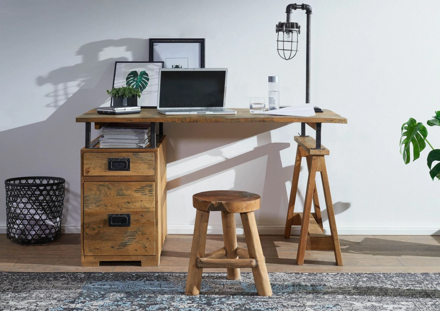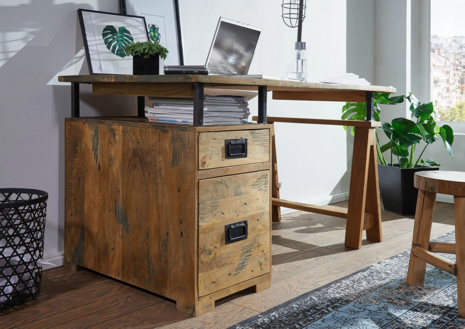 Scrivania/scrittoio in legno massello di mango dallestetica grezza e dal fascino rustico. Il suo colore autentico, tra miele e marrone verniciato, spicca tra le sfumature che fungono da dettagli decorativi naturali. Il design stravagante mette insieme diversi materiali in una combinazione estremamente efficace. La struttura è composta da un unico piano di lavoro sostenuto da sottili ma stabili supporti metallici. Sulla sinistra è presente un mobile con cassetto e vano schedario telescopico. Le aperture sono dotate di maniglie a battente in ferro anticato. Sulla destra la scrivania/scrittoio in legno massello termina con un elemento dappoggio a cavalletto, tipica espressione dello stile industriale.