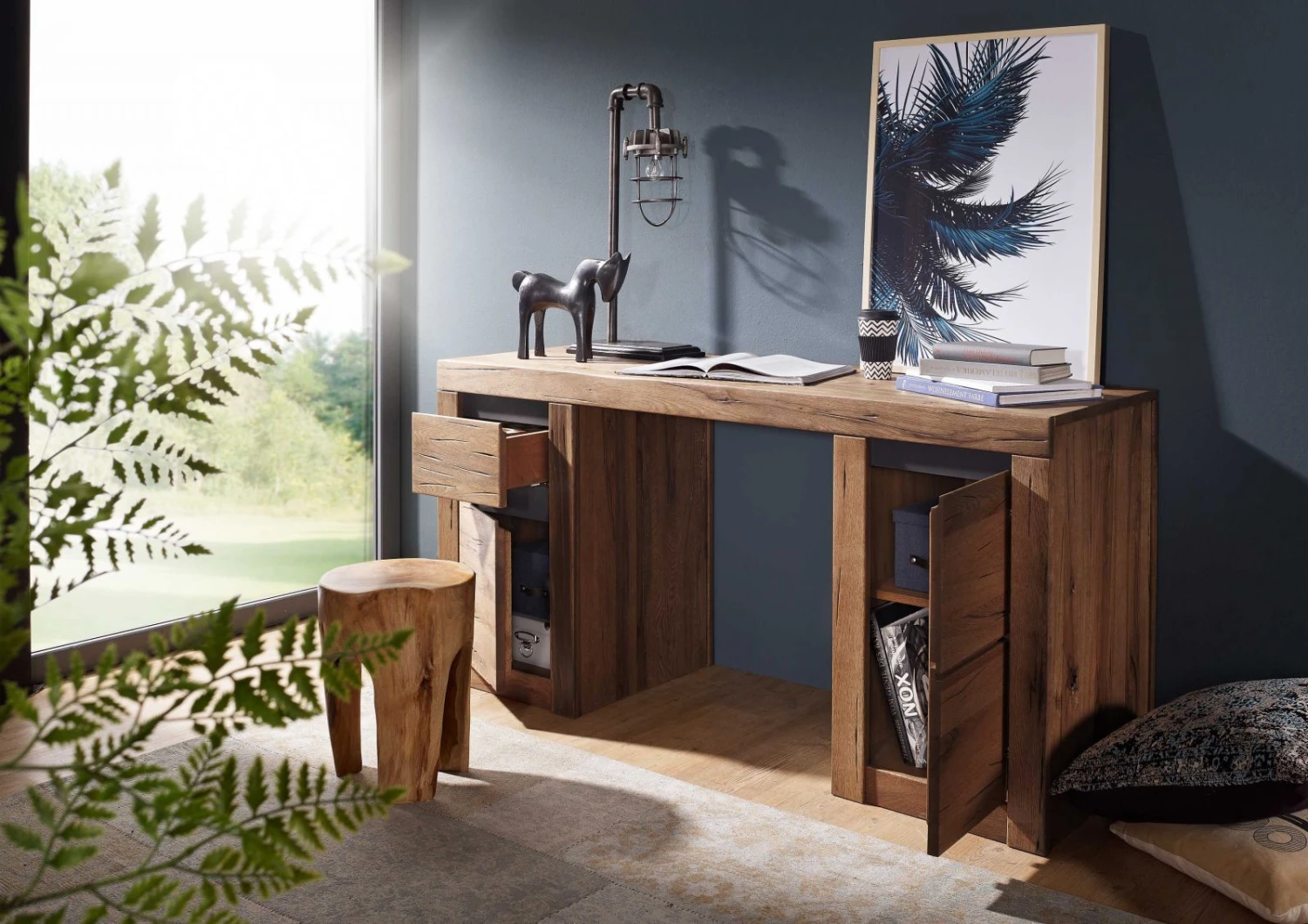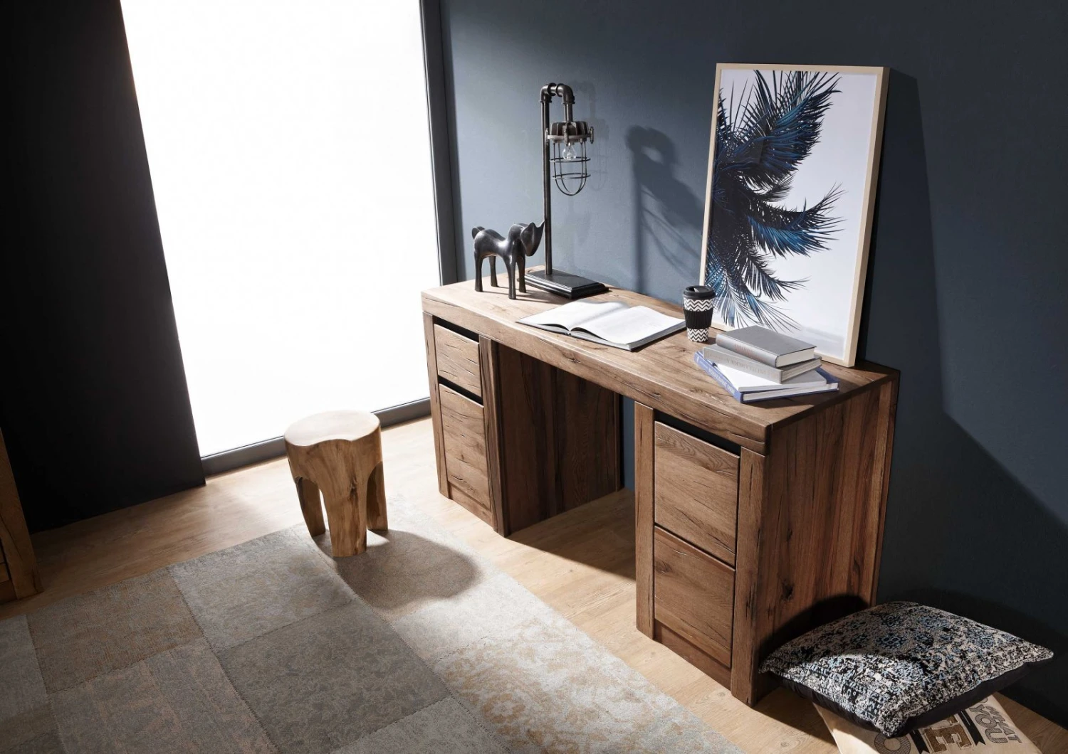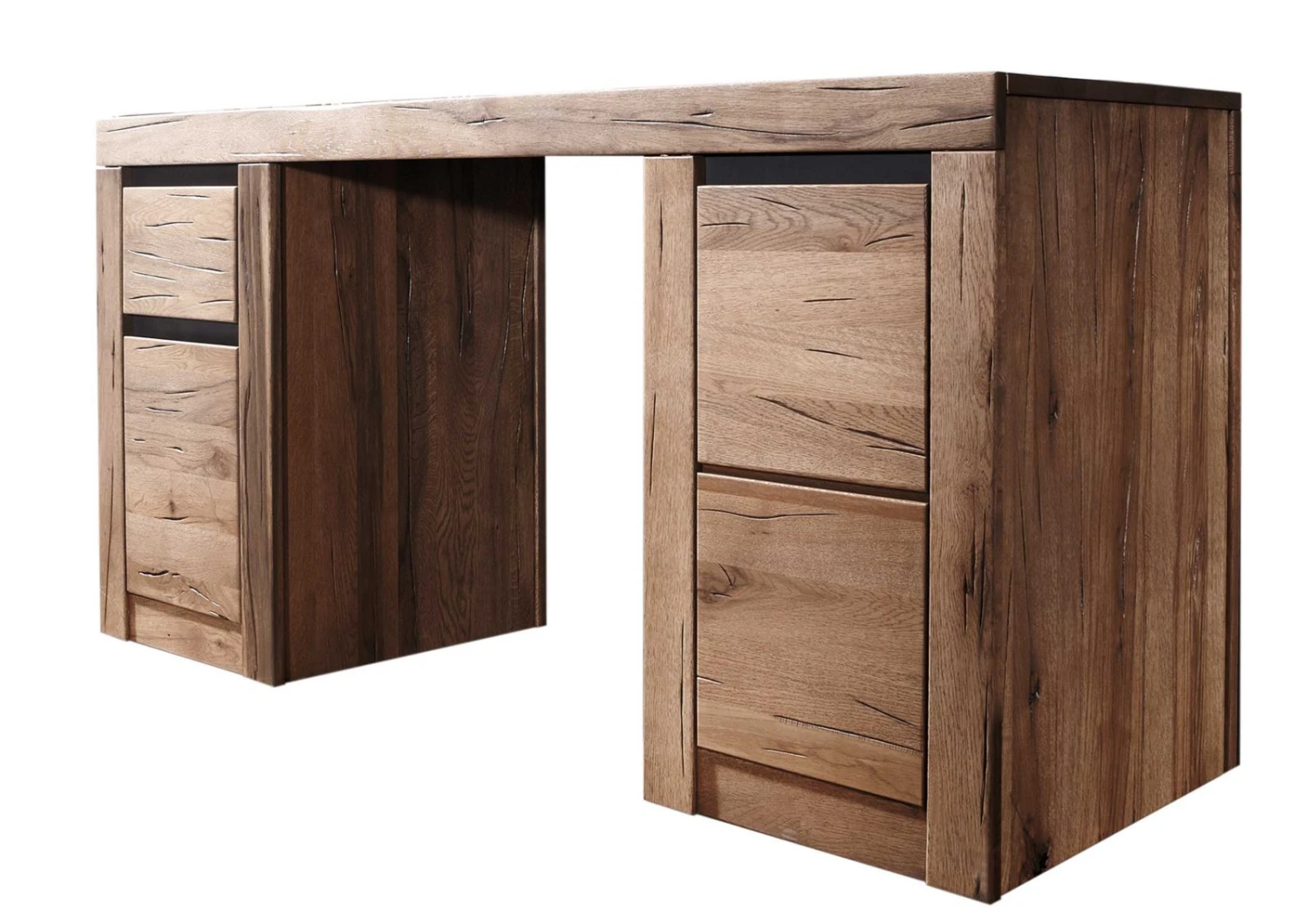 Scrivania in legno massello di cerro in stile moderno, color marrone tabacco con sfumature naturali e superficie ad effetto oliato. Il solido e spesso ripiano di lavoro è retto dalle due sezioni di archiviazione che terminano entrambe con base a zoccolo chiuso. Quella di sinistra dispone di un vano inferiore con sportello e uno superiore in cui è stato collocato un cassetto. A sinistra unanta più grande rivela altri due vani di contenimento sopra e sotto. Tutti gli scomparti sono dotati di sistema soft-close per accompagnare silenziosamente il meccanismo di apertura e chiusura con maniglie a gola. La scrivania in legno massello di cerro è disponibile nelle colorazioni del bianco, tabacco e naturale (misto ocra, sabbia, marrone).