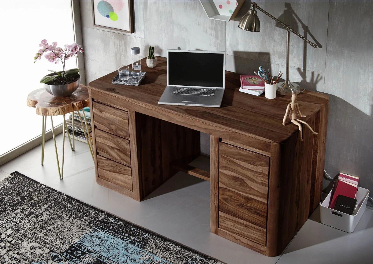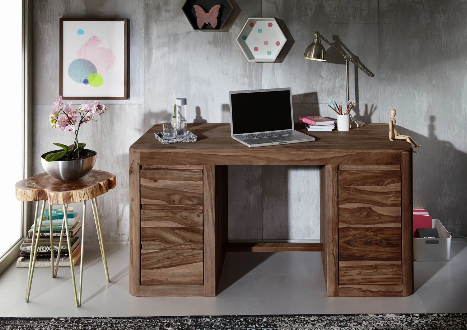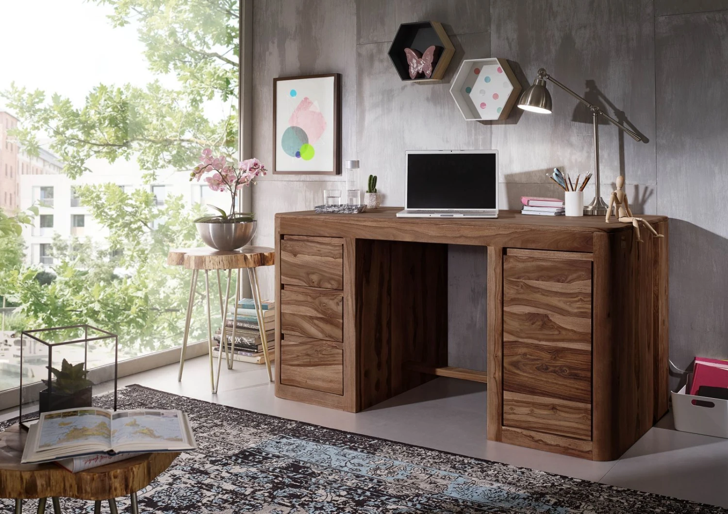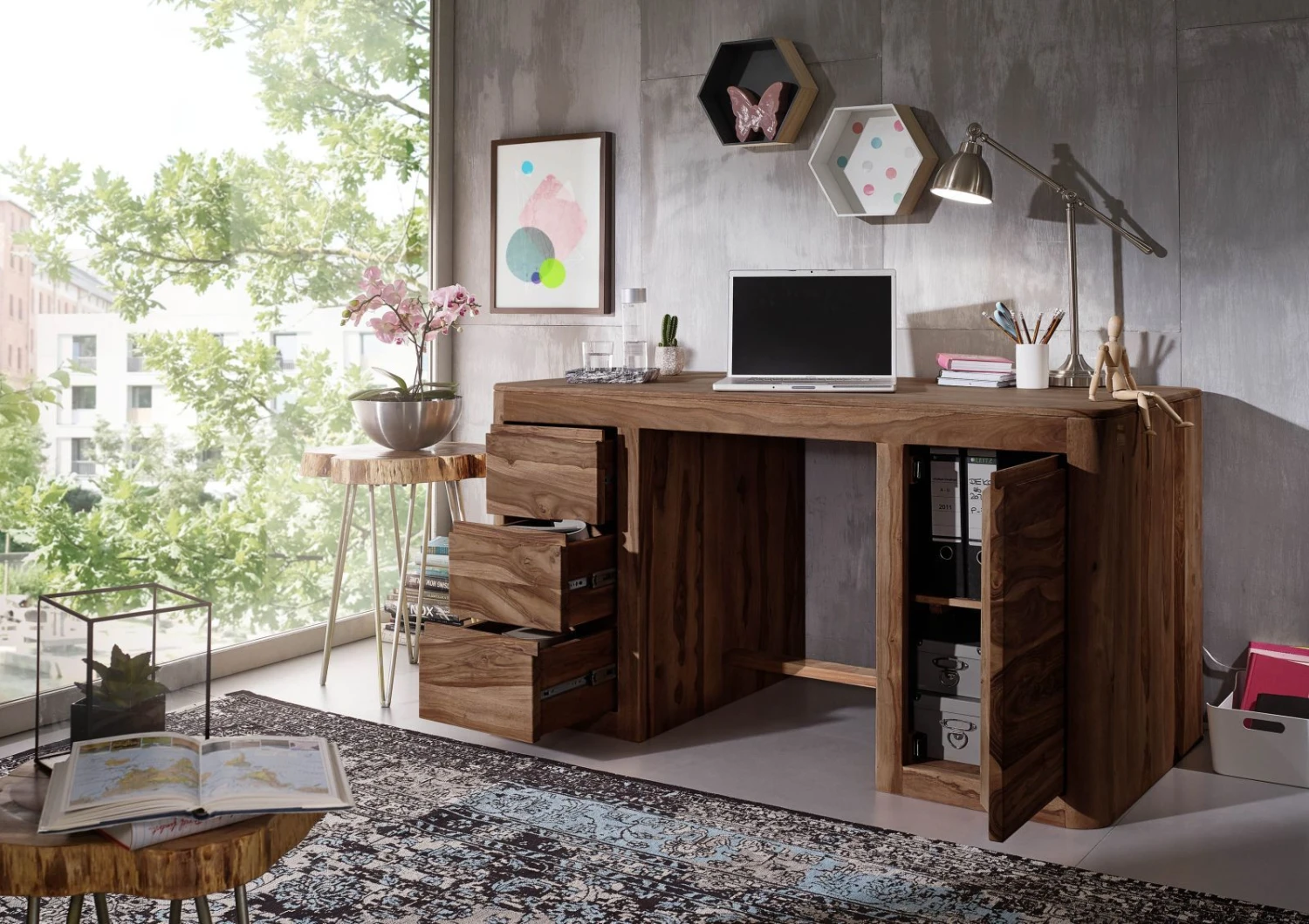 Semplicità e carattere, due aggettivi che vengono immediatamente in mente guardando questa scrivania in legno massello di sheesham acacia. Le dimensioni contenute del mobile consentono di sfruttarlo non solo per lo studio, ma anche in un angolo lavoro della camere da letto. Orientata in modo da addossarla alla parete, si presenta con tre cassetti sulla sinistra, e uno sportello ad anta sulla destra. Luso delle maniglie a gola suggerisce uno stile moderno, tuttavia laspetto solenne gli dà anche un gradevole tocco vintage. Aperta nel centro, la scrivania in legno massello può essere disposta anche verso linterno con uguale effetto estetico. Il color ciliegia affumicato naturale è come una suggestiva pennellata dalle sfumature incredibilmente scenografiche.