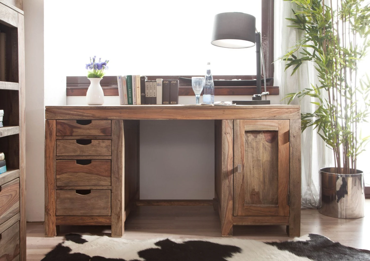 Realizzato in meraviglioso palissandro Sheesham, questo mobile in legno massiccio è caratterizzato da questo impressionante materiale naturale. Il palissandro Sheesham è una materia prima molto ambita dall’industria dell’arredamento. Originario del Brasile e dell’India orientale, questo materiale naturale offre agli occhi un’immagine impressionante. Le evidenti venature di questo legno fanno di ogni pezzo un mobile particolare e incantevole. Per questo, un mobile naturale si integra perfettamente in qualsiasi stile di arredamento. Con questa moderna scrivania, dunque, createvi un posto in cui poter stilare importanti documenti o svolgere altre attività in un’atmosfera accogliente. Il massiccio ripiano permette un uso sicuro e stabile di questo mobile. Grandi scomparti in forma di cassetti e di un armadietto chiuso offrono spazio sufficiente per conservare fascicoli e documenti a portata di mano. Per non compromettere l’aspetto naturale, non sono state aggiunte maniglie sporgenti ai cassetti. Al loro posto, su ciascun cassetto è stato intagliato un incavo per la mano che ne rende possibile l’apertura e la chiusura. L’armadietto è munito di uno spazio unico, con una capienza ottimale e un aspetto più leggero. Con la tonalità di colore Nature Grey, a questa scrivania è stata data una colorazione esclusiva che può essere definita senza tempo. Grazie alle superfici trattate con l’olio, è stata salvaguardata la naturalezza del legno di palissandro.