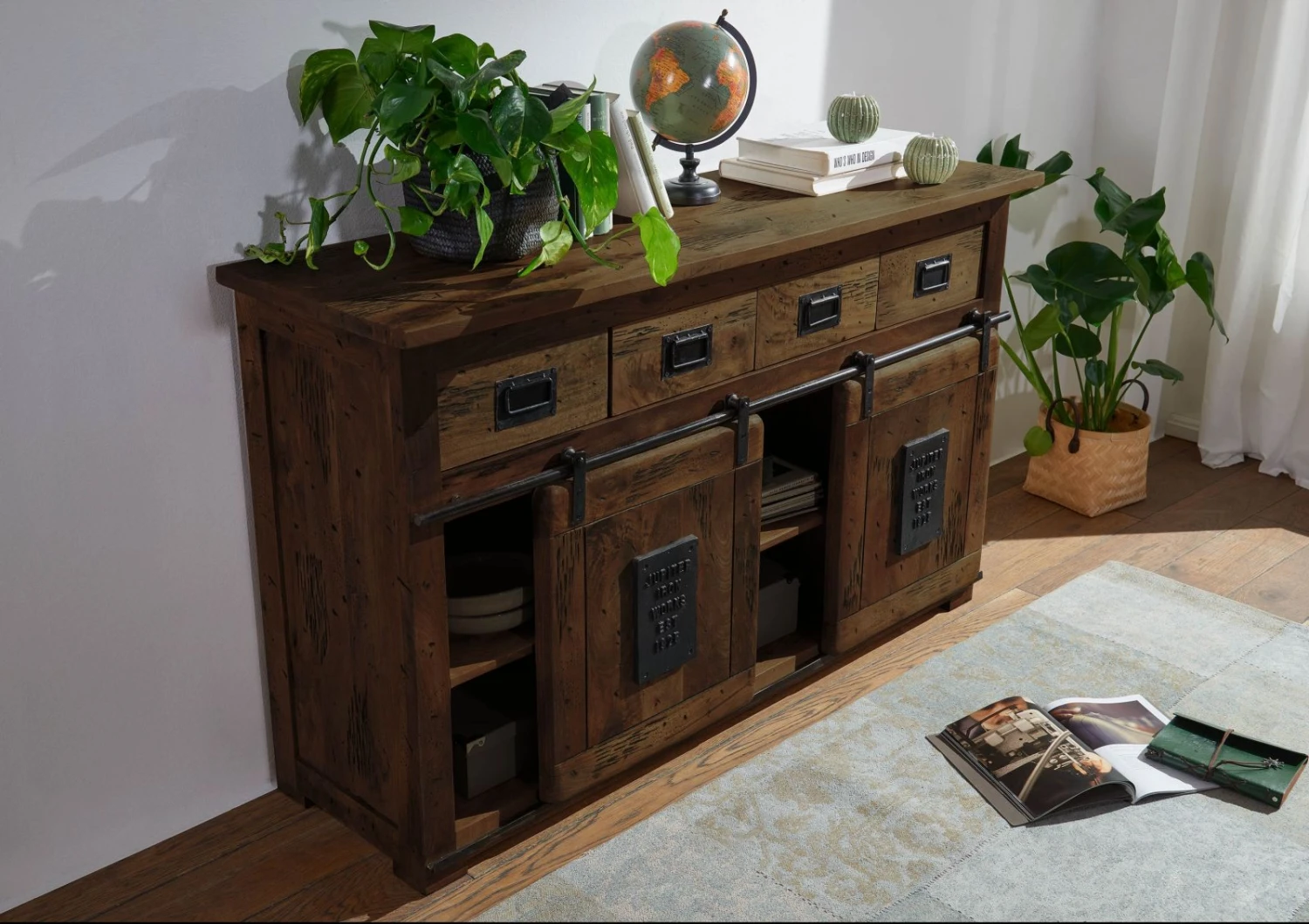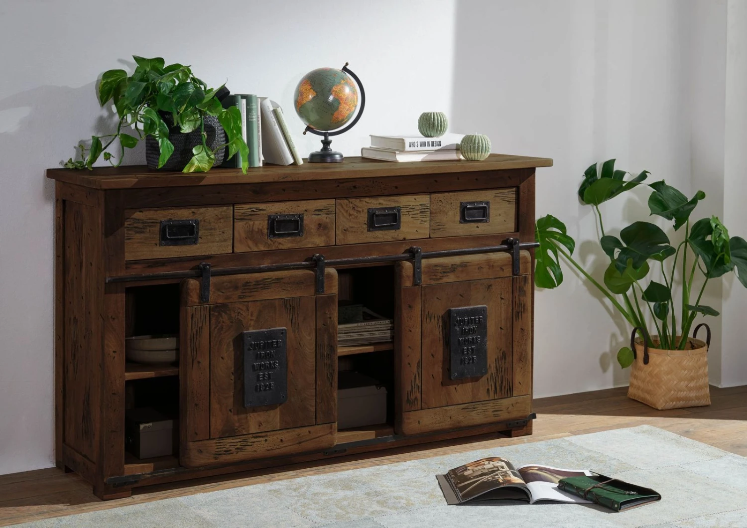 Questa credenza della collezione RAILWAY coniuga spazio e stile in un equilibrio perfetto. Due sono le tendenze estetiche che interpreta: vintage e gusto industriale. Una discreta finitura laccata marrone mette in risalto l’interessante lavorazione a colpi di pialla del legno, mentre dettagli in ferro nero completano l’opera.