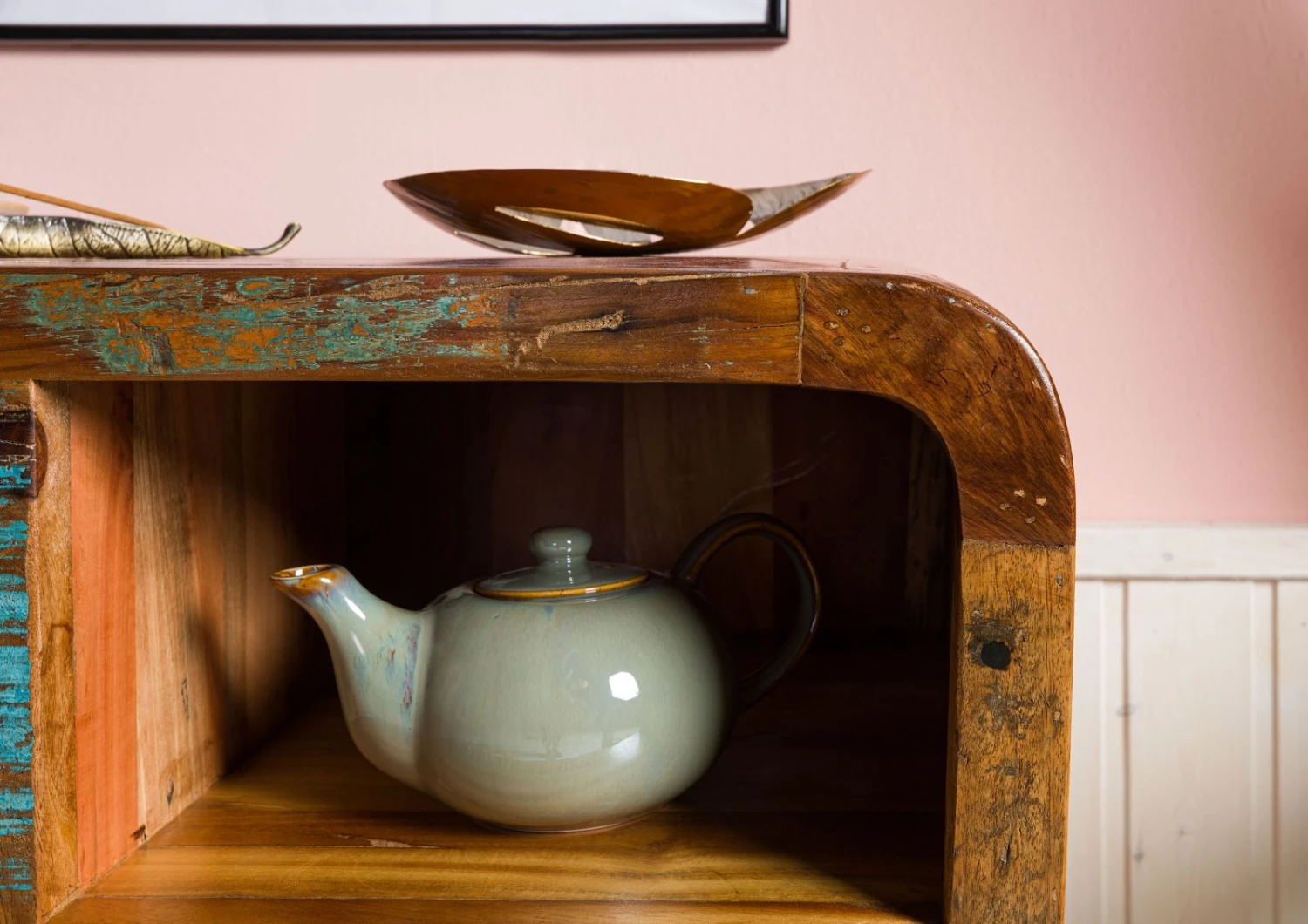 Se apprezzate le opere d’arte irripetibili, non potrete non amare questo mobile: la forma asimmetrica con un lato arrotondato attira magicamente l’attenzione. Anche le gambe hanno decise inclinazioni differenti, proprio come era in voga negli anni ’60. Ogni esemplare è inoltre un pezzo unico: i residui di colore e i diversi gradi di usura segnano la materia in maniera ineguagliabile. Il colore del vostro modello può quindi differire da quello del mobile raffigurato.