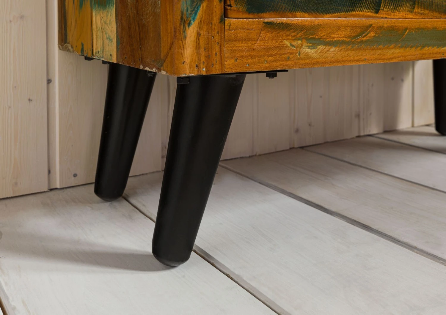 Realizzato in legno di recupero, aggiunge personalità alla stanza. L’angolo arrotondato reinterpreta le forme classiche degli anni ’60. I residui di vernice colorata del legno riciclato riempiono l’aria di allegria. La lieve asimmetria e il gioco cromatico disegnano un mobile dotato di grande individualità.