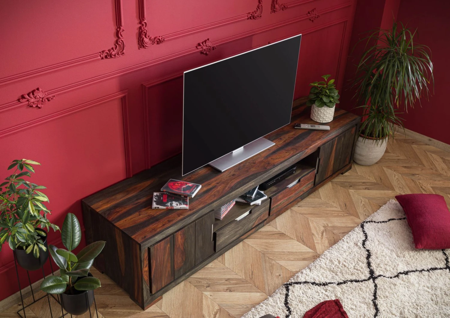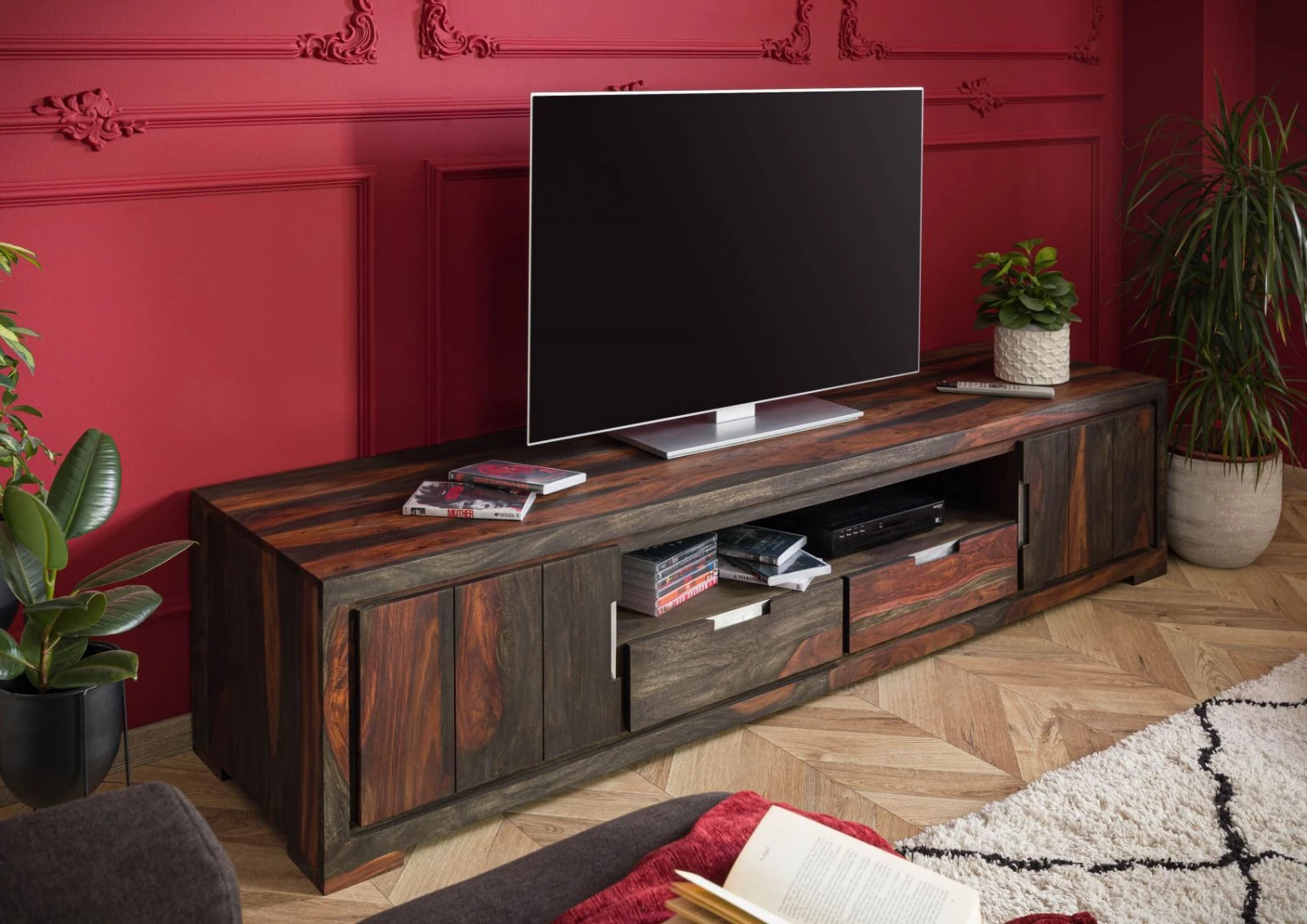 Oltre al design moderno, colpisce in modo particolare anche il meraviglioso materiale con cui è stato realizzato questo mobile TV. Si tratta del legno di palissandro Sheesham che continua ad essere un materiale molto amato. Questa varietà di legno molto richiesta è originaria dell’India e affascina per alcune caratteristiche pregiate. Particolarmente degna di nota è la straordinaria superficie di questo materiale; il legno Sheesham è dotato inoltre di grande robustezza. Il rapporto qualità-prezzo di questa varietà di legno è davvero conveniente. Il legno di palissandro possiede delle venature meravigliose e vistose. La magnifica superficie affascina per i suoi disegni ricchi di contrasti. Oltre alla bellezza della materia prima, la solidità robusta del puro legno di Sheesham di questo mobile TV è una caratteristica di grande pregio che ne garantisce una lunga durata. Il design chiaro di questo elegante mobile TV in puro legno di Sheesham permette di abbinarlo facilmente ad altri elementi di arredo.