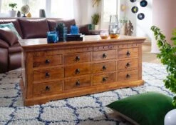 Stupendo tavolino da salotto fabbricato in legno massiccio di acacia in colore miele intenso laccato con sfumature naturali, base a zoccolo aperto e design in puro stile coloniale. Nella sezione di collegamento tra i ripiano superiore e il corpo del mobile è presente una bordatura con incisioni a mezzaluna su ogni lato. Nella parte frontale il tavolino da salotto dispone di 12 piccoli cassetti con maniglia in metallo a battente. Lampia superficie di appoggio si apre a metà lunghezza e rivela un capiente vano nascosto per riporre biancheria e accessori.