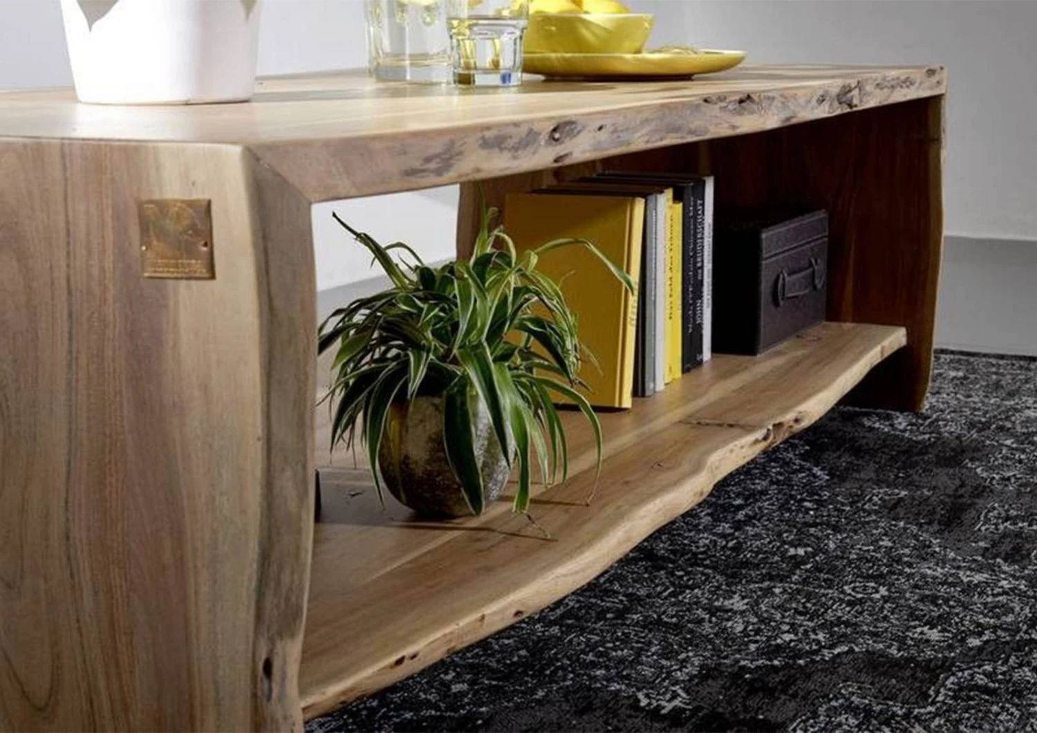 Lasciatevi stregare dal legno con questo tavolino in acacia: il bellissimo tavolino della collezione PURE ACACIA colpisce per le sue venature vivaci. Questo aspetto è tipico del legno duro dell’acacia e viene valorizzato al meglio dalla verniciatura lucida. Un’altra caratteristica di questo mobile in legno massiccio che colpisce sono i suoi bordi irregolari e unici. Questi splendidi bordi naturali vogliono conservare la forma originale dell’albero. Questo spazioso tavolo convince anche in termini di funzionalità: sul ripiano inferiore si possono appoggiare snack, riviste e telecomando.