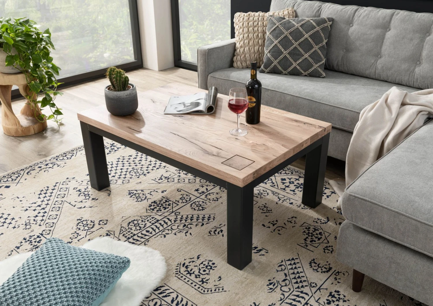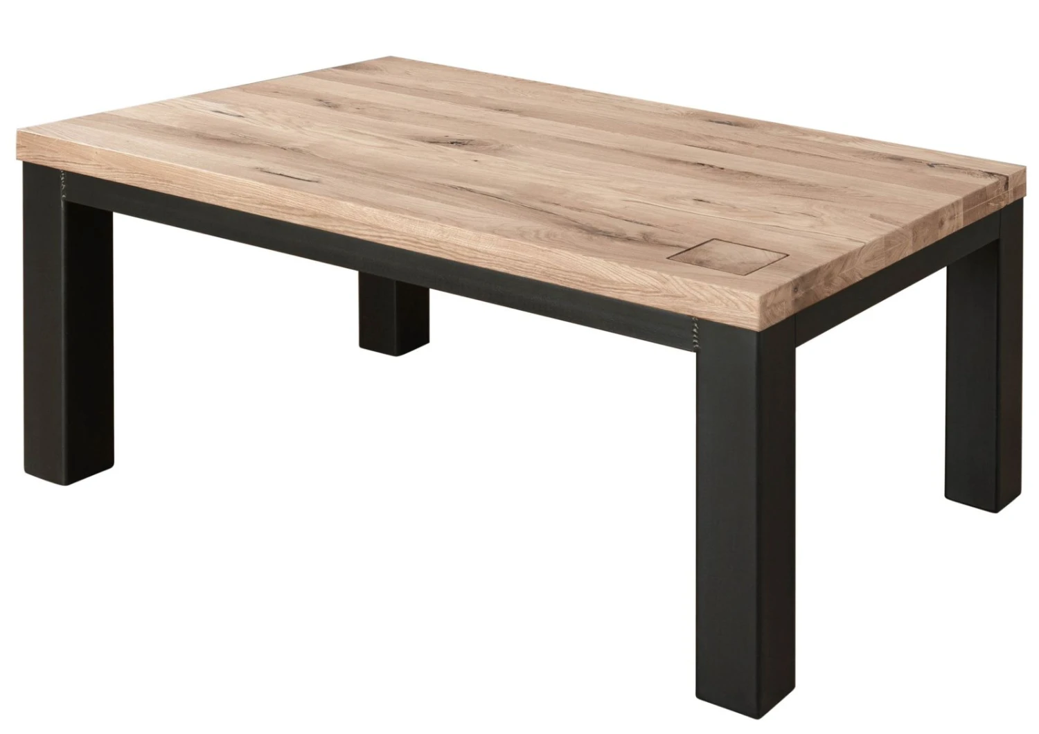 Tavolino da salotto in legno massello di quercia selvatica, stile moderno, superficie trattata con oliatura, colore bianco dominante dalle nuance marrone. La struttura portante è fatta in metallo satinato grigio canna di fucile, con una suggestiva sovrapposizione di quattro travi in materiale naturale, disposte luna accanto allaltra a formare un pezzo unico. Il contrasto tra le due componenti del tavolino da salotto in legno massello ha lobbiettivo di accostare elementi diversi per realizzare un gradevole effetto estetico. Da notare infatti la differenza tra la superficie liscia, uniforme del telaio e quella irregolare, rustica del ripiano. Calore e autenticità si sprigionano in ogni intaglio, crepa a venatura, per un accessorio darredo tanto semplice quanto bello.