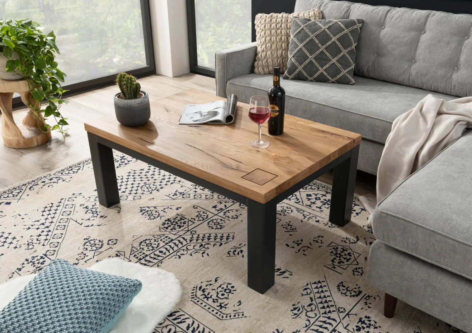 Tavolino da salotto in legno massello di quercia selvatica, stile moderno, superficie trattata con oliatura, colore naturale dominante dalle nuance marrone. La struttura portante è fatta in metallo satinato grigio canna di fucile, con una suggestiva sovrapposizione di quattro travi in materiale naturale, disposte luna accanto allaltra a formare un pezzo unico. Il contrasto tra le due componenti del tavolino da salotto in legno massello ha lobbiettivo di accostare elementi diversi per realizzare un gradevole effetto estetico. Da notare infatti la differenza tra la superficie liscia, uniforme del telaio e quella irregolare, rustica del ripiano. Calore e autenticità si sprigionano in ogni intaglio, crepa a venatura, per un accessorio darredo tanto semplice quanto bello.