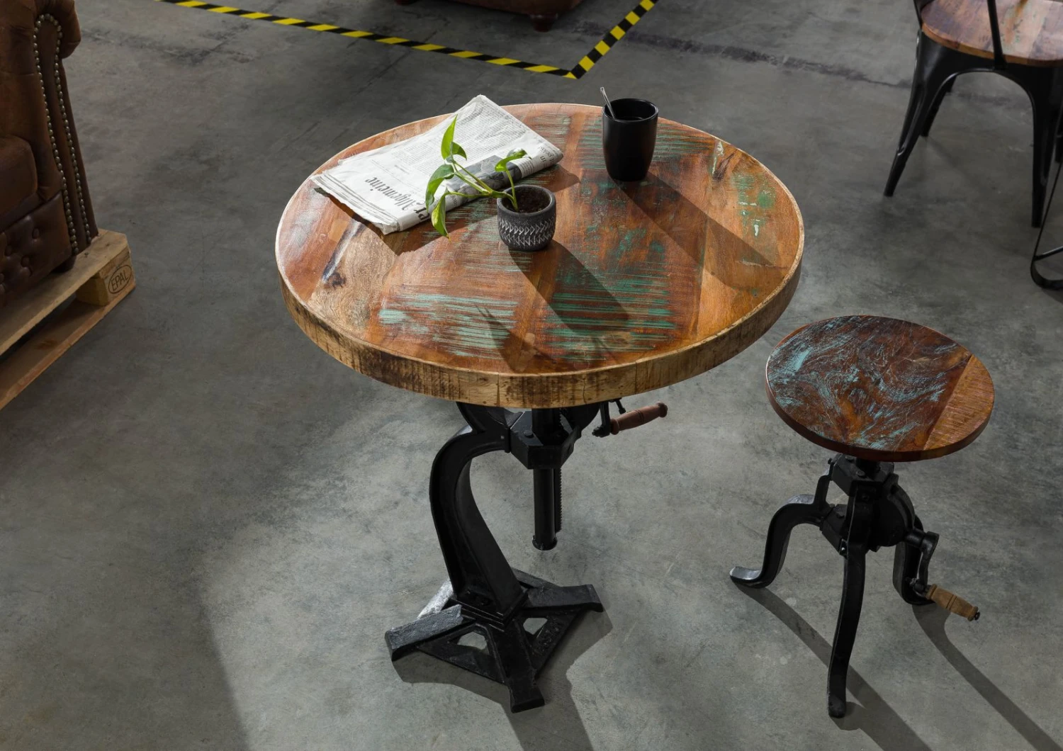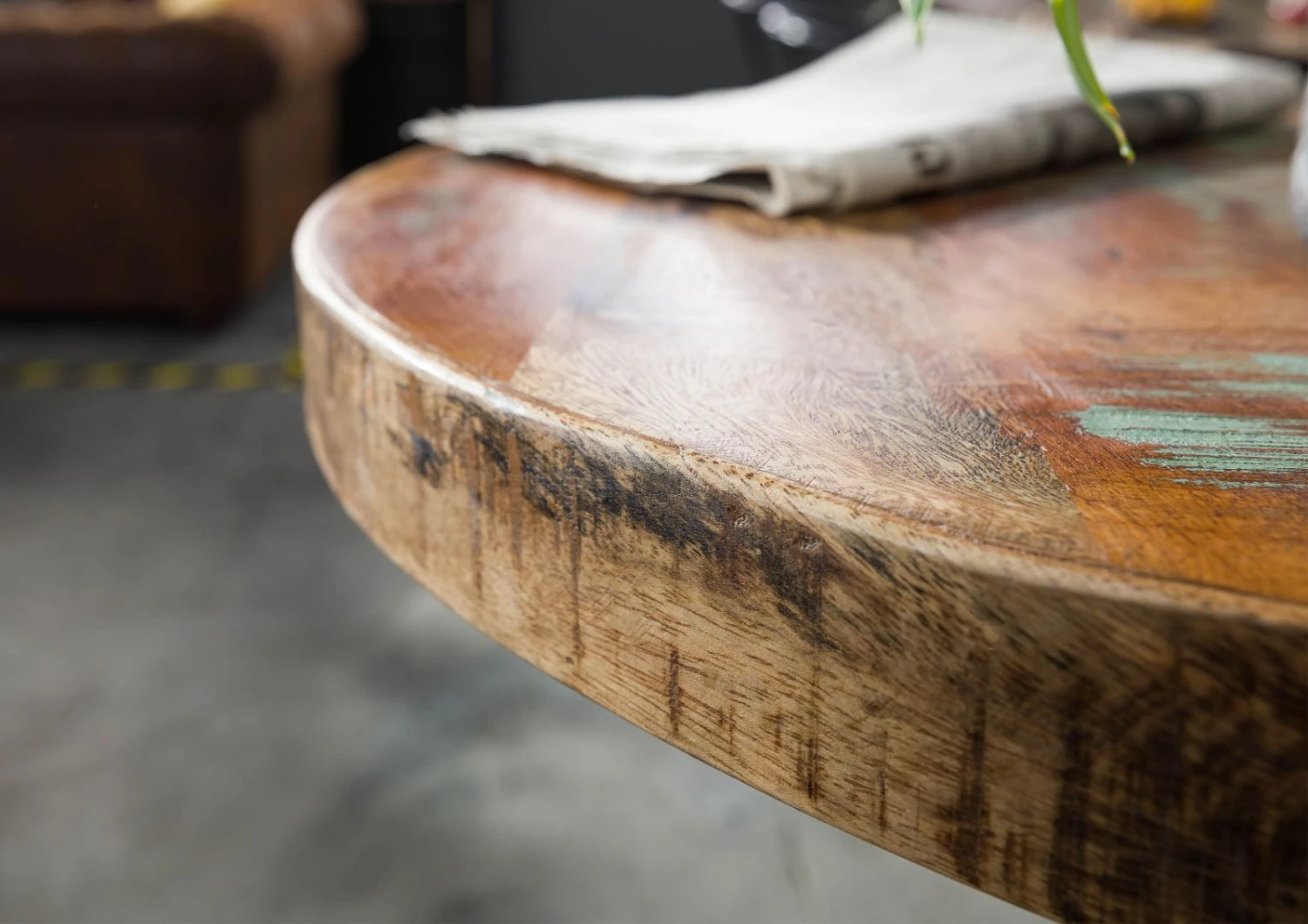 Con questo grazioso tavolino d’appoggio avrete tra le mani un pezzo unico e dagli utilizzi davvero molteplici, che lo rendono davvero speciale. Un tavolino d’appoggio magnifico, prodotto con trattamenti elaborati e specifici, con legno riciclato. La forma rotonda e i bordi piatti sono stati realizzati con i migliori intagli e dipinti per il trattamento finale del legno. Attraverso questo trattamento, il legno riciclato restaurato è stato dotato di un sottile strato protettivo che resisterà ai più svariati utilizzi. Le gambe del tavolino d’appoggio sono state realizzate in ferro battuto e offrono una stabilità assicurata, regalando un aspetto esclusivo, che è una peculiarità di questa serie. Forma e design intensificano maggiormente l’espressione nostalgica che ad un primo sguardo dona questo pezzo unico. Nel mezzo del tavolino, è posta una leva, per la regolazione dell’altezza che può essere regolata individualmente. Questa pratico tavolino può essere utilizzata per l’uso quotidiano.