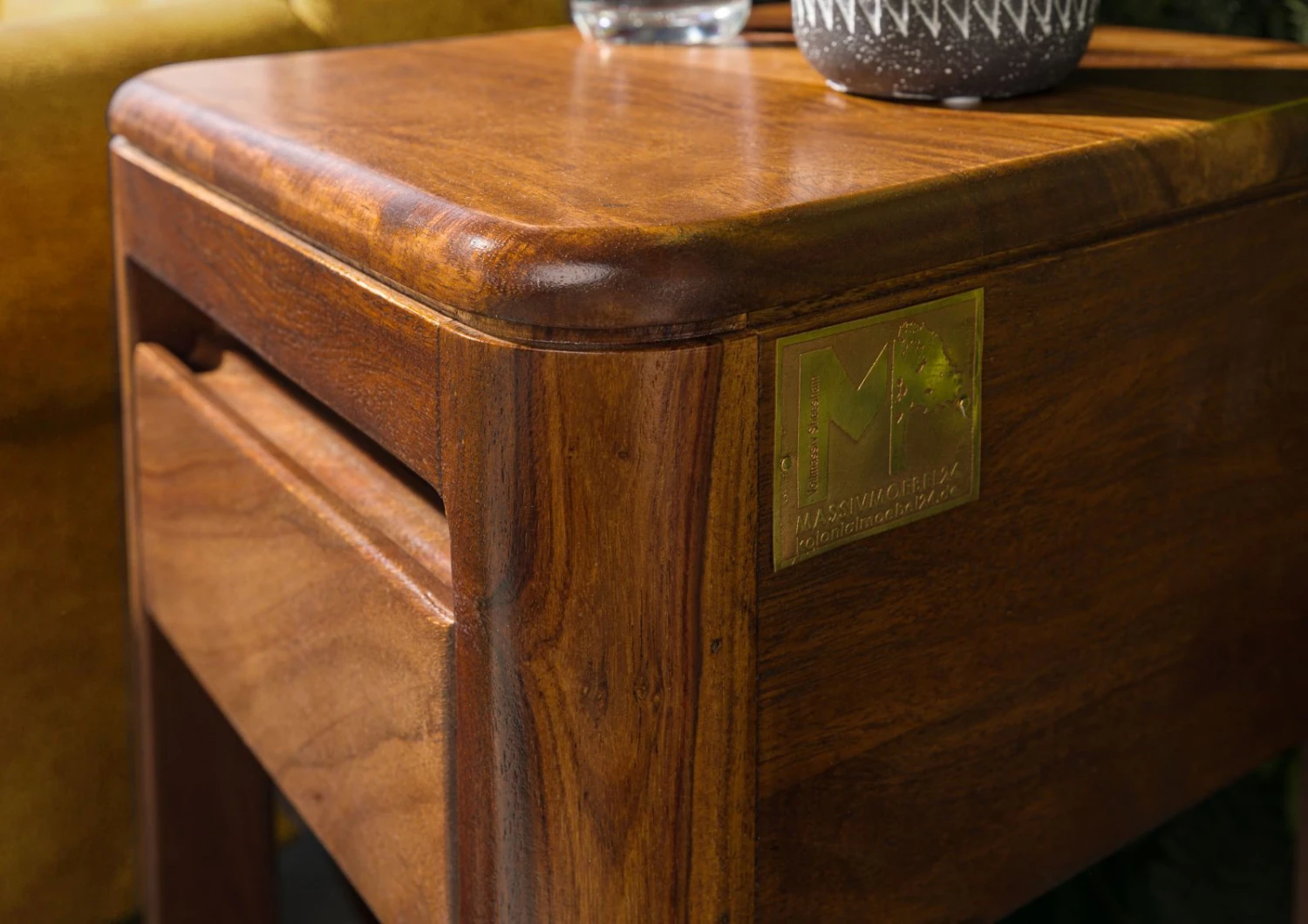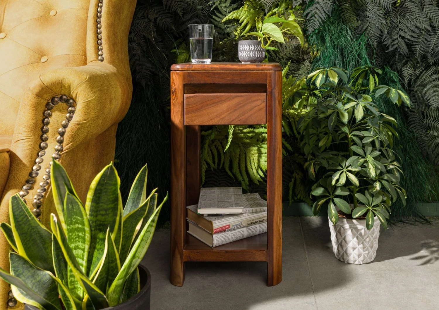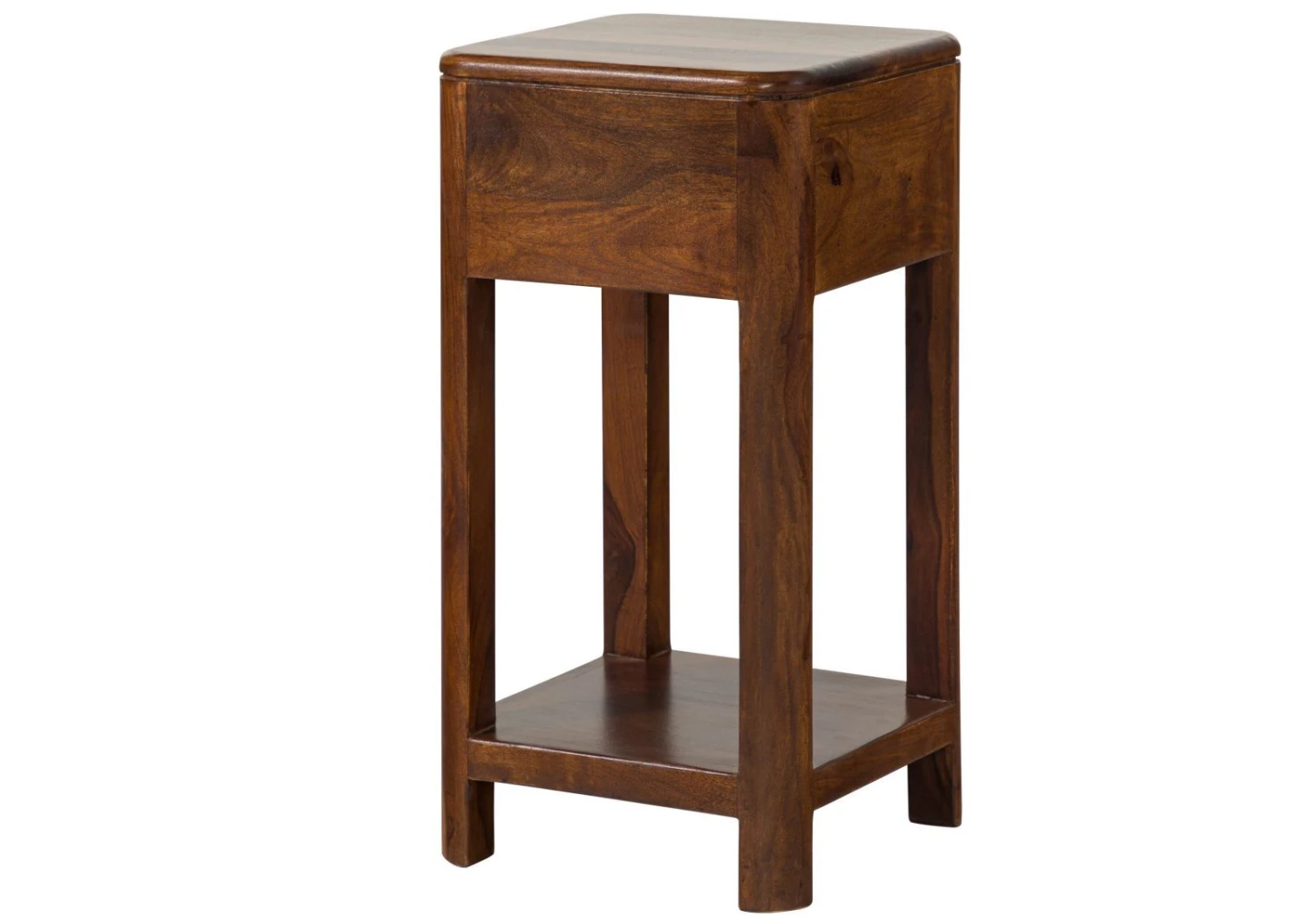 Le dimensioni non contano quando si ha una personalità smisurata. Questo moderno tavolino in legno massello di sheesham acacia si fa immediatamente notare dovunque venga collocato. Il suo design è estremamente semplice ma molto curato. Il color noce cerato asseconda morbidamente le linee lisce e levigate della superficie. Le stupende sfumature del durame diventano poi vere e proprie decorazioni pittoriche senza bisogno di aggiungere altro allopera di madre natura. Un cassetto, un ripiano superiore e uno inferiore offrono sufficiente spazio per riporre piccoli oggetti e soprammobili. È un tavolino in legno massello perfetto da posizionare nellingresso, ma può sostituire egregiamente anche un tradizionale comodino.
