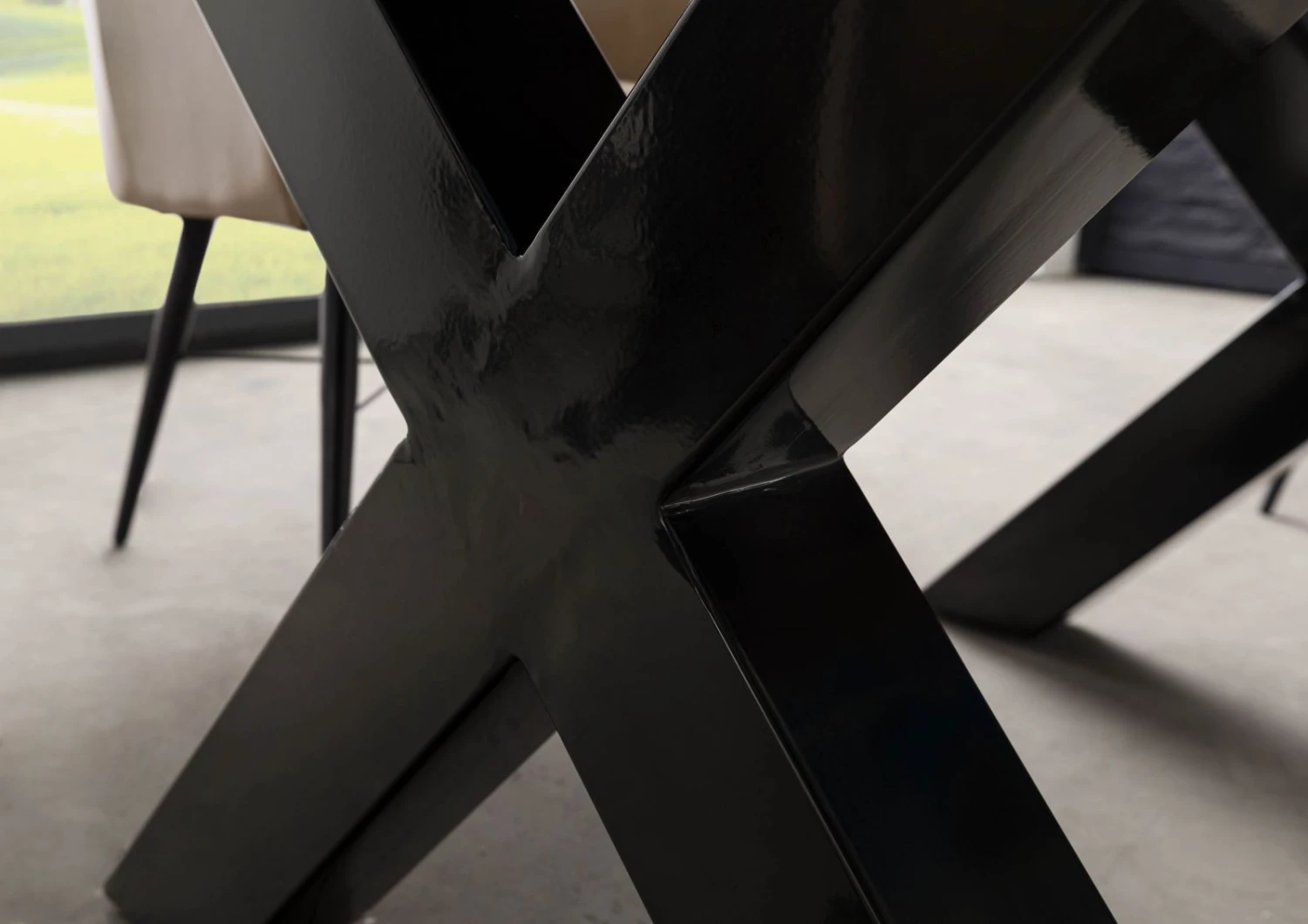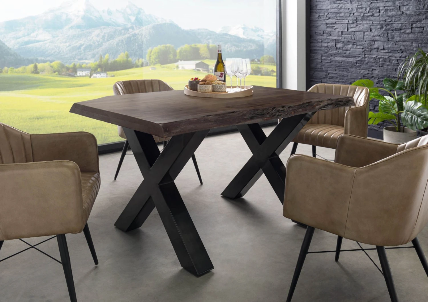 Il piano è realizzato in legno massello modellato sulla crescita naturale dell’albero. I bordi a vista, la trama palpabile e l’inconfondibile luminosità del legno naturale non sono difetti. Al contrario: ogni dettaglio della natura rende il tavolo più autentico fugando ogni dubbio sull’originalità del materiale. Le gambe a X in metallo creano un contrasto efficace con un accento moderno.