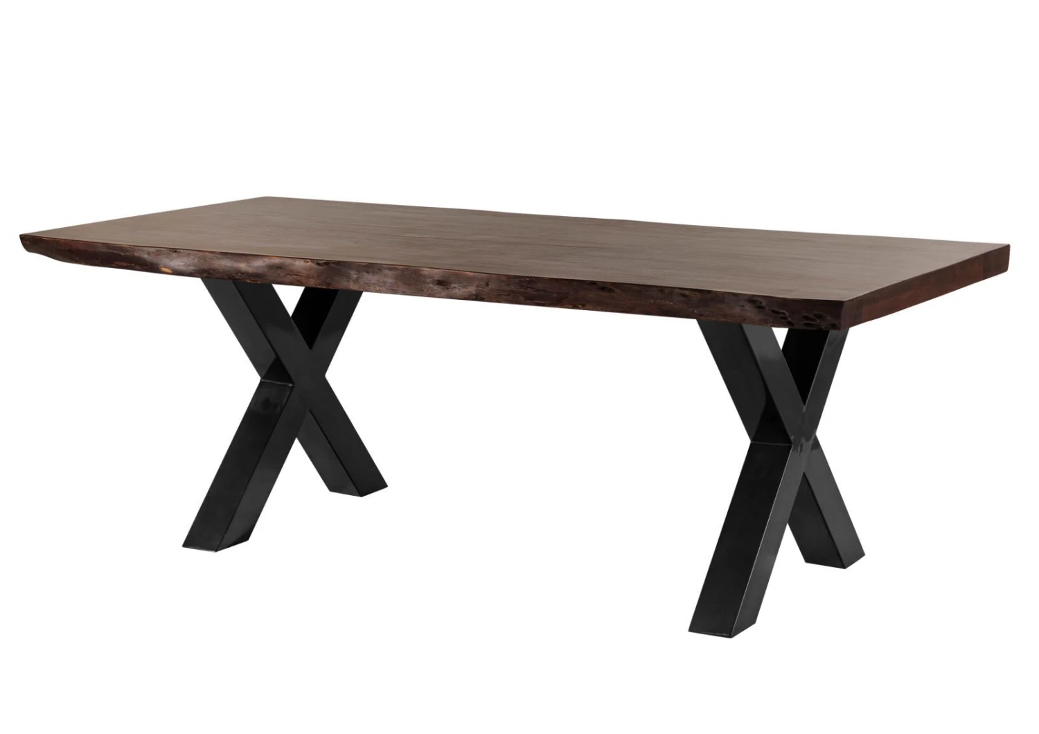 Il piano è realizzato in legno massello modellato sulla crescita naturale dell’albero. I bordi a vista, la trama palpabile e l’inconfondibile luminosità del legno naturale non sono difetti. Al contrario: ogni dettaglio della natura rende il tavolo più autentico fugando ogni dubbio sull’originalità del materiale. Le gambe a X in metallo creano un contrasto efficace con un accento moderno.