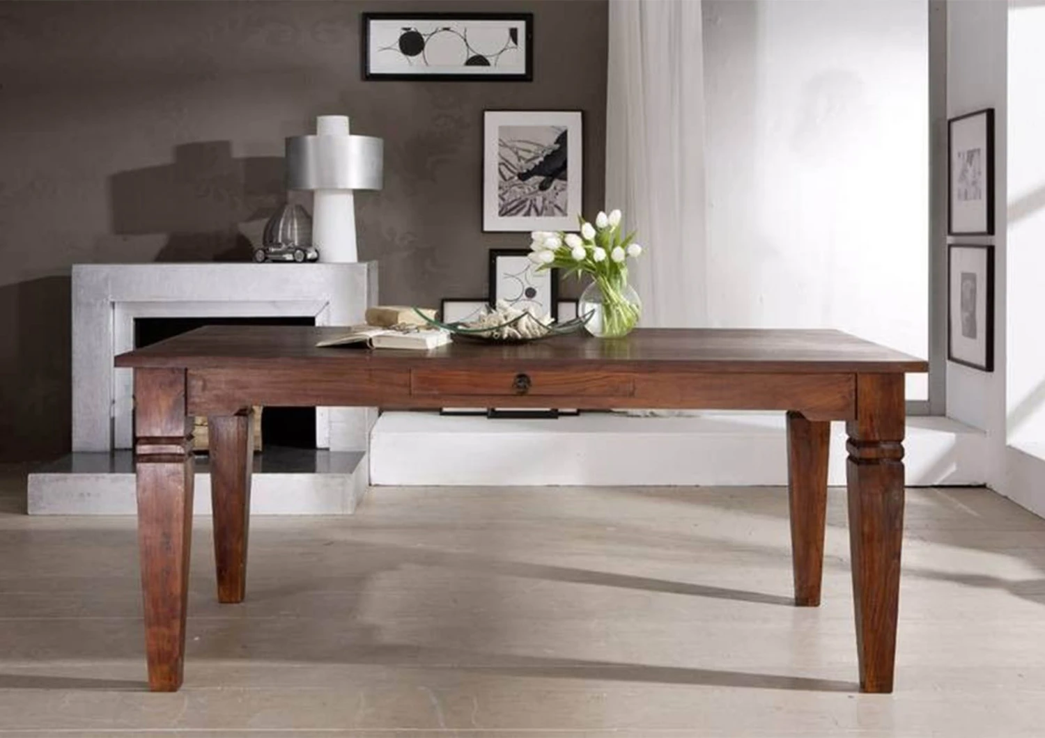 Il design di questo tavolo in legno di acacia massiccio è adatto sia per l’arredo moderno che per l’interior design più tradizionale. Le sue dimensioni ti permetteranno di ospitare da 6 a 8 persone, mentre le sua finiture laccata e il suo colore torrone contribuiranno ad aggiungere un tocco piacevole sia caldo che elegante al tuo salotto. Con due cassetti, questo tavolo ti permetterà di riporre a portata di mano tutte le posate e le altre tovaglie. Optare per una decorazione originale e unica con la vasta gamma di mobili di ispirazione coloniale offerti dalla nostra collezione OXFORD.