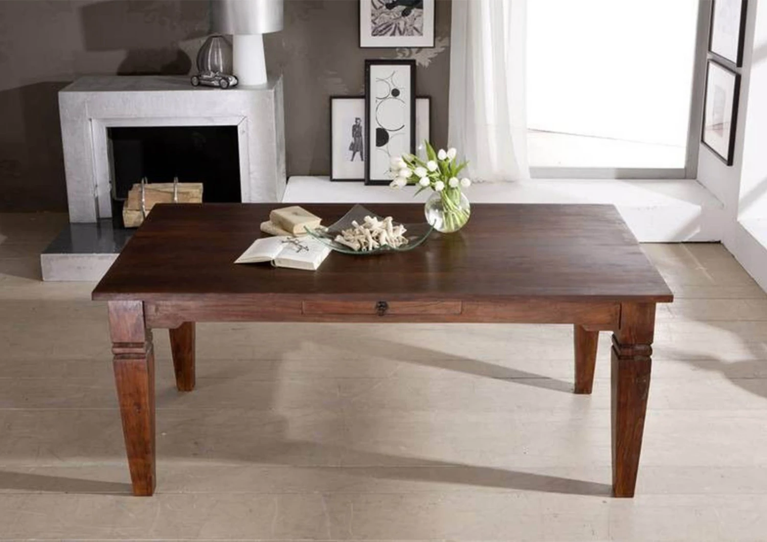 Il design di questo tavolo in legno di acacia massiccio è adatto sia per l’arredo moderno che per l’interior design più tradizionale. Le sue dimensioni ti permetteranno di ospitare da 6 a 8 persone, mentre le sua finiture laccata e il suo colore torrone contribuiranno ad aggiungere un tocco piacevole sia caldo che elegante al tuo salotto. Con due cassetti, questo tavolo ti permetterà di riporre a portata di mano tutte le posate e le altre tovaglie. Optare per una decorazione originale e unica con la vasta gamma di mobili di ispirazione coloniale offerti dalla nostra collezione OXFORD.
