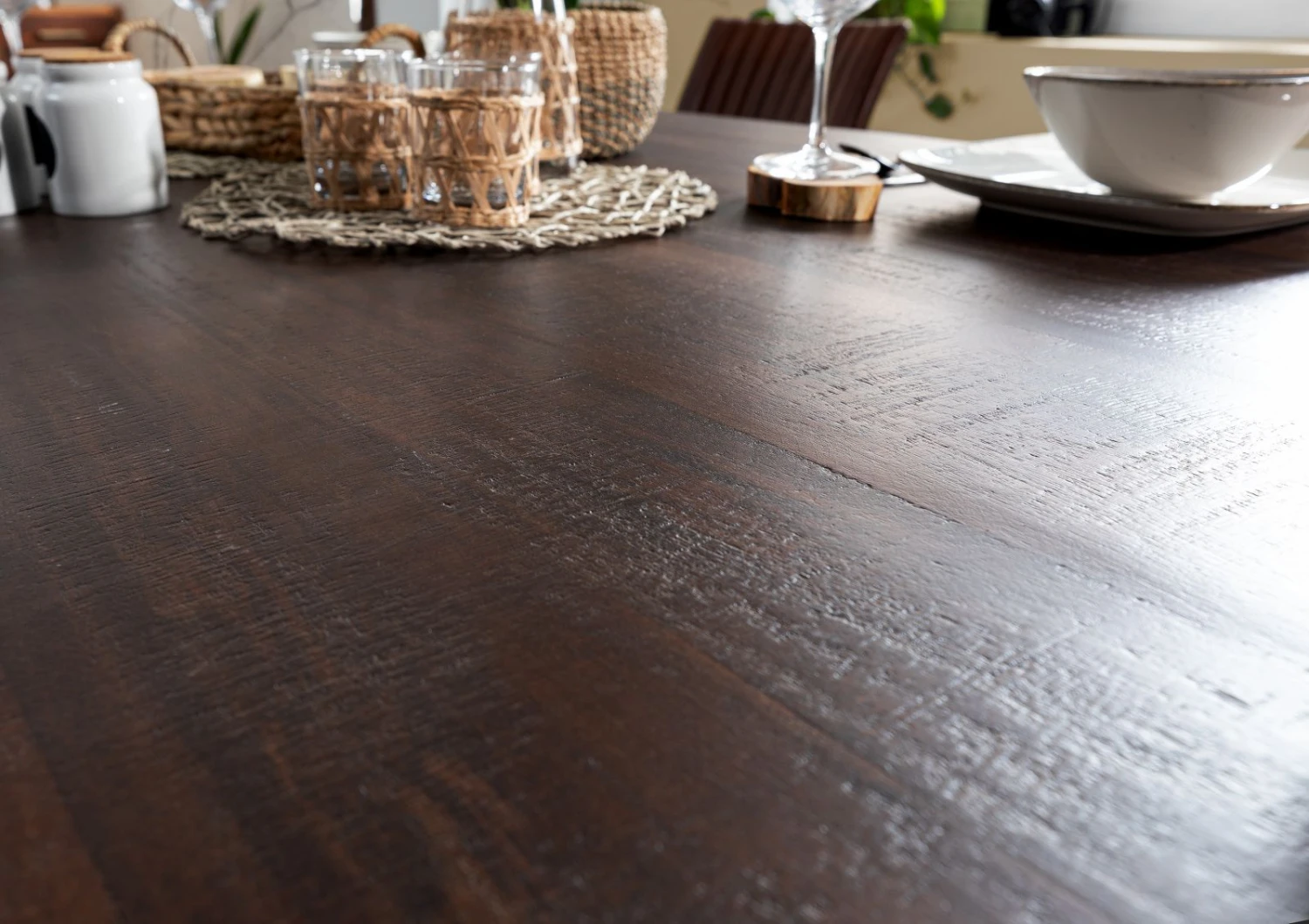 Tuttavia questo elegante tavolo non è solo bello, ma anche buono perché il legno proviene da piantagioni agricole dove viene coltivato il frutto. Dopo circa 15 anni, la resa degli alberi diminuisce e questi vengono abbattuti per lasciare il posto a colture più giovani. Il legno di mango così ottenuto trova una seconda vita in questi splendidi mobili. Il tavolo ha una finitura con tinta marrone scuro che dona un aspetto elegante.