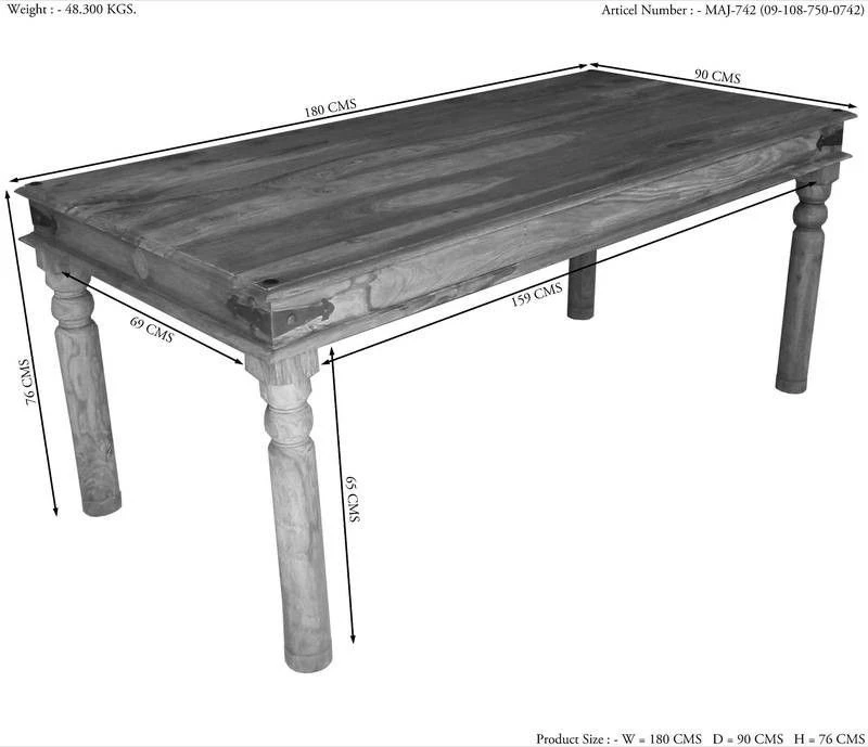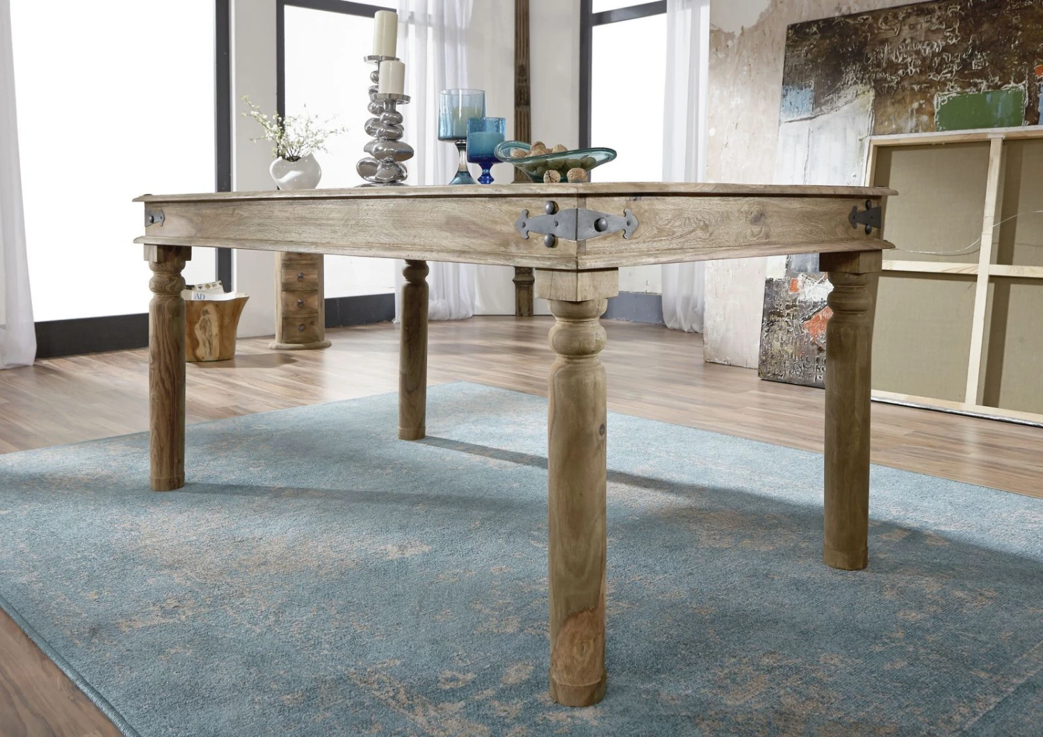 Con questo tavolo da pranzo LEEDS renderete molto particolare la sala da pranzo o il vostro salotto. Si abbina facilmente e con quasi tutti gli stili di arredamento già esistenti o con altri splendidi mobili di questa linea. Oltre alla scelta della materia prima, la bellezza di questo tavolo è dovuta anche alla sua lavorazione. Il palissandro usato per questo mobile è considerato da sempre un legno nobile, successivamente trattato con olio per legno. Per esaltare al massimo le magnifiche venature e la struttura del legno, consigliamo di utilizzare dell’olio per mobili oltre ai soliti prodotti per la cura del legno. Questo impedisce che questo materiale naturale si secchi, preservandone la brillantezza. Durante il processo di produzione è nata una colorazione particolare tendente al grigio, state certi che apprezzerete ogni giorno le magnifiche venature del legno di Sheesham. Il tavolo da pranzo è molto resistente e si adatta in modo particolare ad altri mobili più grandi e che sfruttiamo quotidianamente nelle nostre case: sarà così anche per questo tavolo da pranzo.