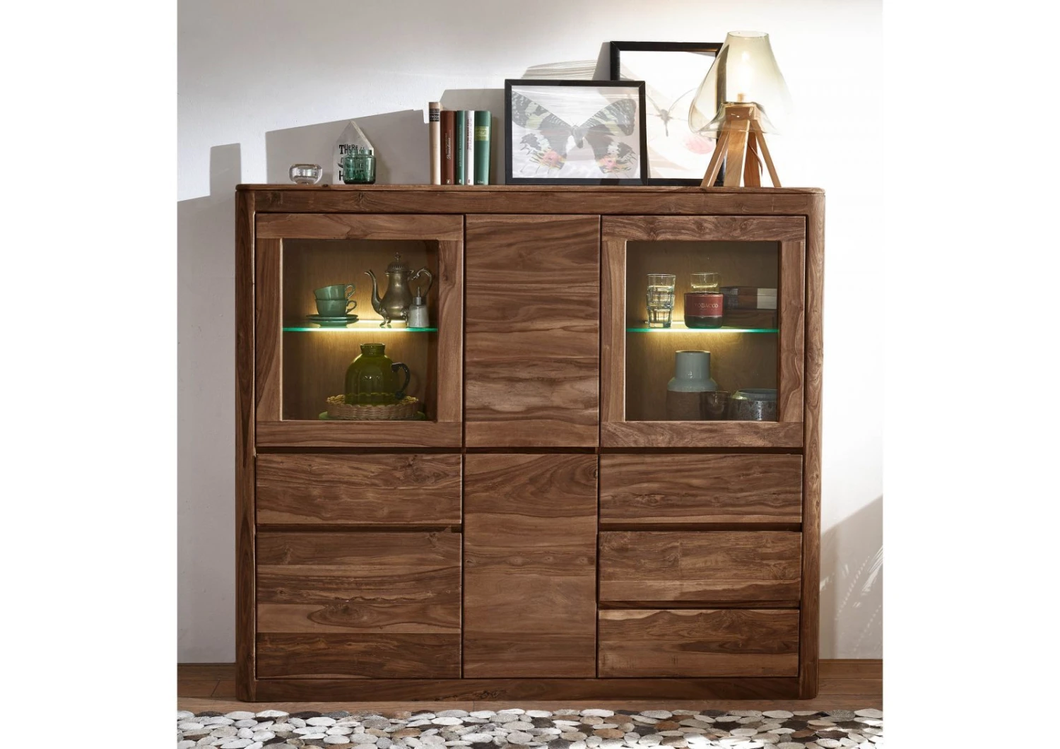 Chi non vorrebbe avere nel proprio salotto o nella propria cucina questa credenza in legno massello di sheesham acacia? Cinque sportelli e tre cassetti forniscono tutto lo spazio di archiviazione che si può desiderare. Molto particolare la eco geometrica delle due vetrinette gemelle, e luso delle maniglie a gola che rimarca la scelta dello stile contemporaneo. Le superfici trasparenti creano un contrasto scenografico con lintenso color ciliegia affumicato sul resto del mobile. Anche in questo caso è possibile inserire la retroilluminazione interna. A firmare questa magnifica credenza in legno massello, tanto per cambiare è la linea Toronto. Qui si trova la terra di mezzo tra classico e moderno, tra insolito e quotidiano, tra utile e bello.