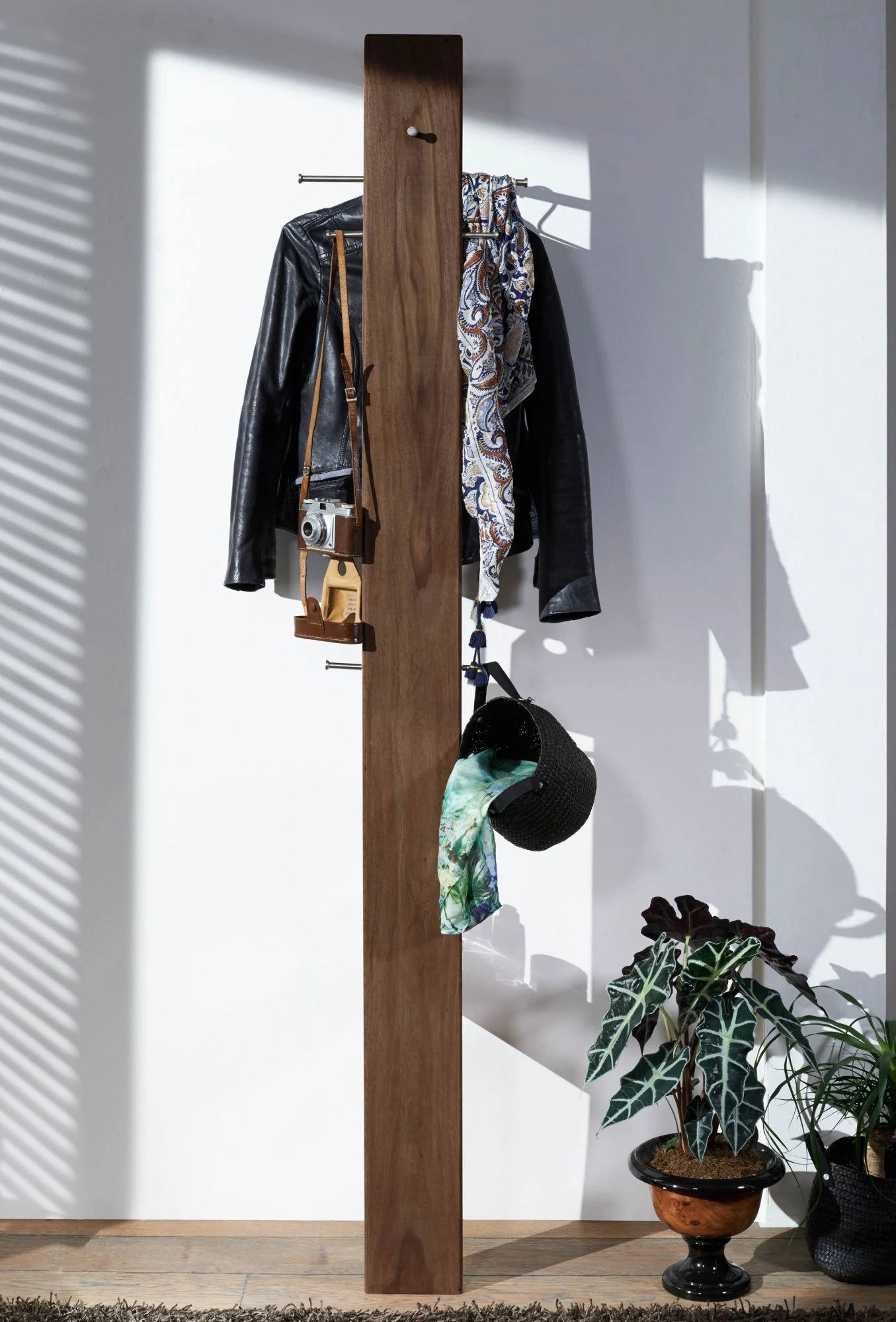 Tra i leitmotiv della collezione Toronto vi è stravolgere le regole. Questo insolito appendiabiti in legno massello di sheesham acacia ha esattamente questo scopo. Nel design concettuale di una singola asse fissata alla parete, cè tutto loccorrente per disporre abiti e accessori. Supporti e barre di metallo fanno da ganci e da sostegni per grucce, cappelli e altri indumenti. La classica destinazione duso di un mobile è stata modificata con il valore aggiunto di un design assolutamente originale. Il prodotto è un complemento utile ed allo stesso tempo. Questo appendiabiti in legno massello sembra quasi una scultura darte moderna. Raffinata e minimale si distingue anche per il colore caldo del durame più pregiato, nelle sfumature ciliegia affumicato, bruno e marrone.