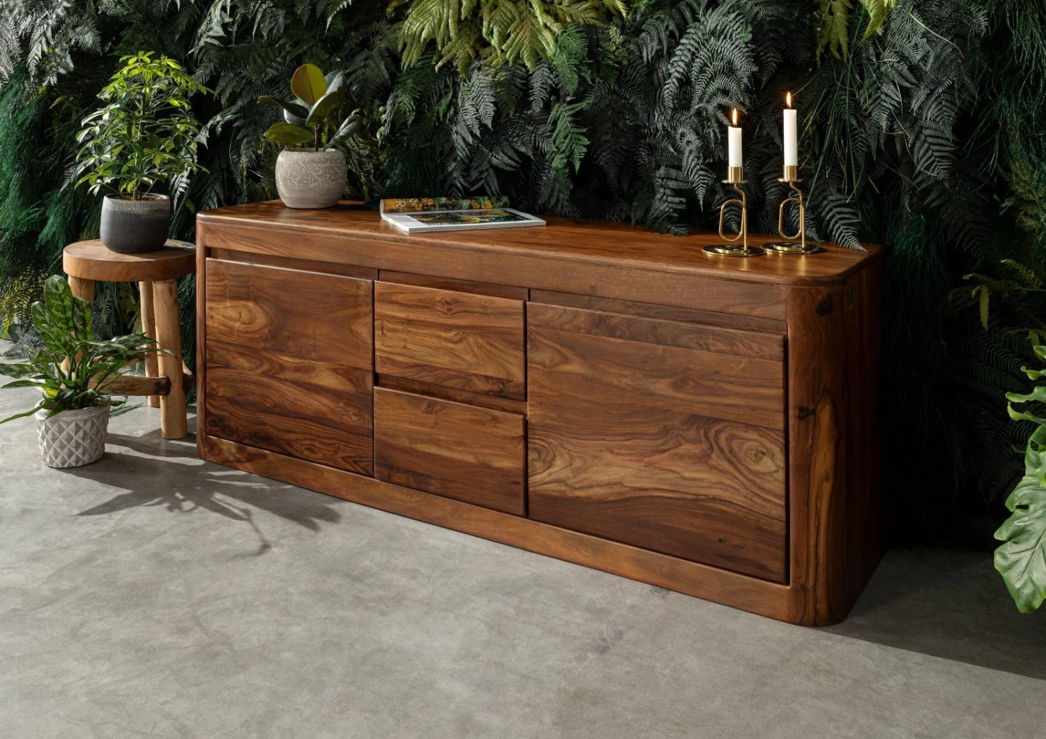 Per arredare efficacemente un ambiente bisogna tenere conto di due aspetti fondamentali, lo spazio e la luce. Questa credenza in legno massello di sheesham palissandro è fatta apposta per catturare la luminosità grazie alla superficie laccata del suo intenso color noce naturale. Le sue dimensioni importanti esigono una collocazione adeguata, magari in fondo alla stanza o lateralmente, di fronte alla porte/finestre. Due sportelli laterali e una coppia di cassetti centrali, forniscono molto spazio di archiviazione. La credenza in legno massello non ha maniglie ma aperture a gola, per sottolineare il concept contemporaneo. Essendo più largo che alto, il mobile può anche diventare un perfetto supporto per la tv in salotto.