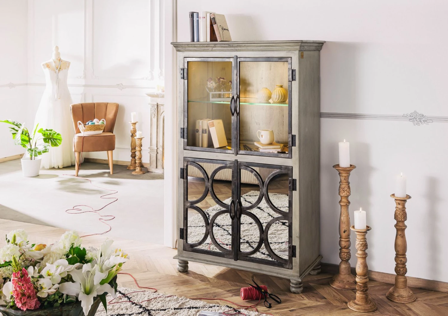 Date carattere alla vostra casa con un audace fusione di stili: questa vetrinetta in legno massello della collezione HERMITAGE unisce il romanticismo delle atmosfere country al sapore vintage dell’art déco. Il suggestivo fascino degli anni ’20 è evocato in particolare dalle decorazioni in ferro disegnate sui frontali a specchio delle ante inferiori. I piedini a forma sferica e la cornice che borda il corpo superiore e inferiore del mobile parlano invece il romantico linguaggio degli arredi delle case di campagna.