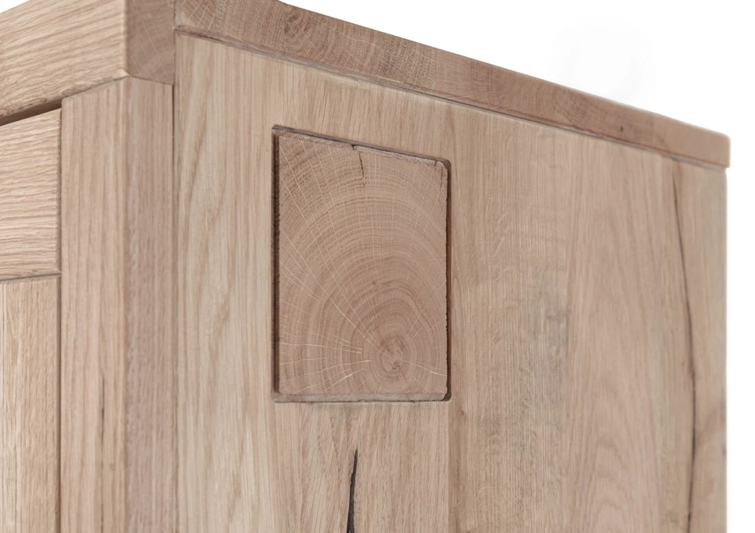 Vetrina in legno massello di quercia selvatica, base e telaio di raccordo in metallo, struttura in materiale naturale colore originale, superficie trattata ad oliatura, autentiche imperfezioni, finiture di pregio. Lestetica di questo mobile è molto versatile, tanto che può essere collocato tranquillamente in soggiorno, in cucina o anche nello studio. Il concept moderno e la combinazione di elementi di archiviazione ricordano vagamente quello di una credenza, da qui la sua anima eclettica. La vetrina in legno massello presenta nella sezione superiore destra una porta trasparente che rivela due ripiani per un totale di tre vani. Sulla sinistra e in basso sono stati ricavati altri tre sportelli ciechi per altrettanti spazi di contenimento. Tutti le ante hanno sistemi di apertura a gola.