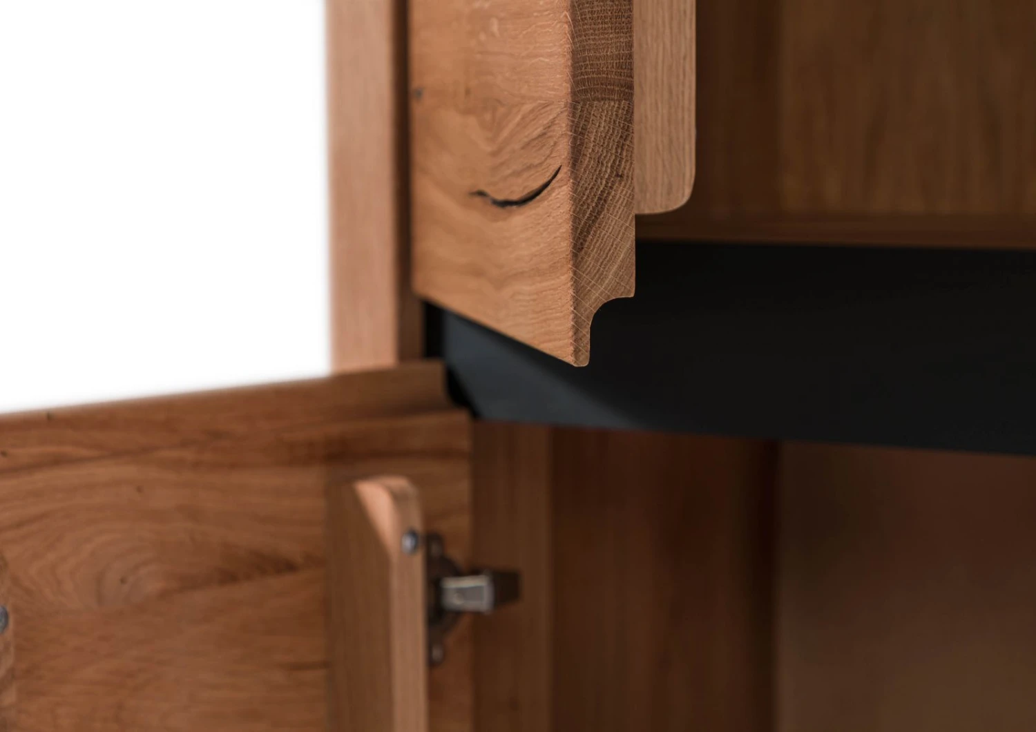 Vetrina in legno massello di quercia selvatica, base e telaio di raccordo in metallo, struttura in materiale naturale colore originale, superficie trattata ad oliatura, autentiche imperfezioni, finiture di pregio. Lestetica di questo mobile è molto versatile, tanto che può essere collocato tranquillamente in soggiorno, in cucina o anche nello studio. Il concept moderno e la combinazione di elementi di archiviazione ricordano vagamente quello di una credenza, da qui la sua anima eclettica. La vetrina in legno massello presenta nella sezione superiore destra una porta trasparente che rivela due ripiani per un totale di tre vani. Sulla sinistra e in basso sono stati ricavati altri tre sportelli ciechi per altrettanti spazi di contenimento. Tutti le ante hanno sistemi di apertura a gola.