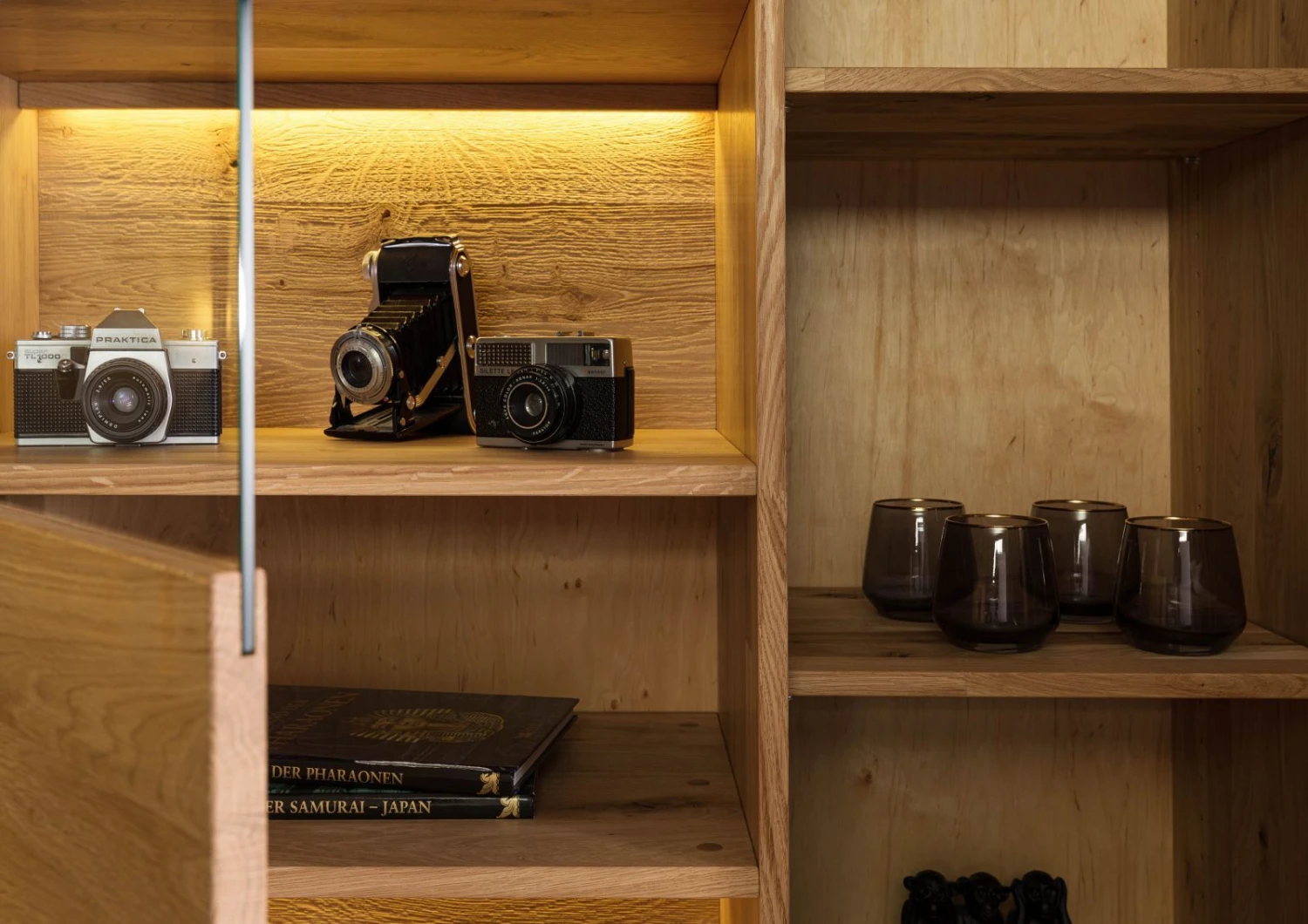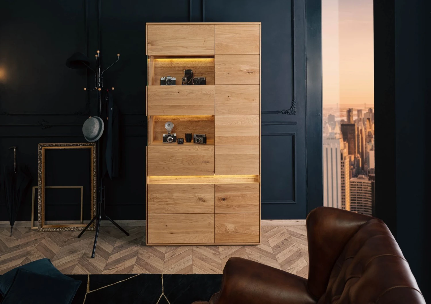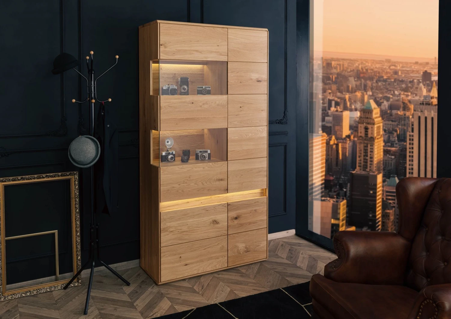 Vetrina in legno massiccio di quercia con illuminazione e ante senza maniglie