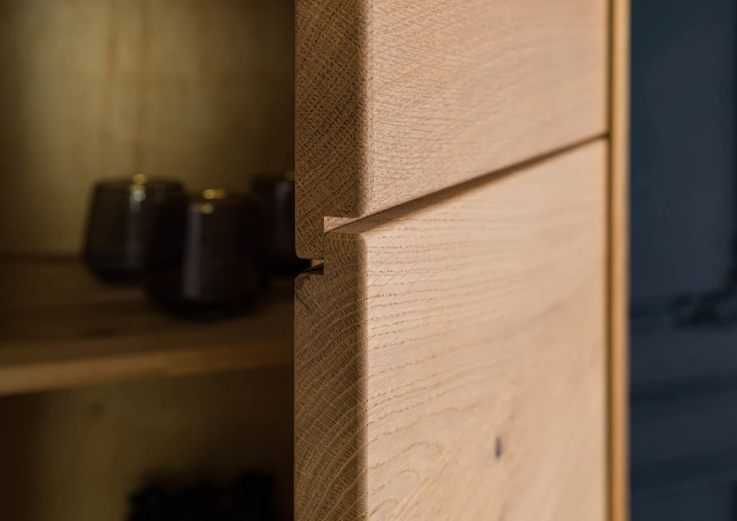 Infatti, i LED integrati illuminano la vetrina in legno con un morbido luccichio. L’illuminazione indiretta porta lo sguardo all’interno dell’anta. Il legno del bordo è spazzolato e cattura l’attenzione con il suo aspetto leggermente più grezzo. Gli angoli smussati del pannello superiore completano il look moderno di questo mobile.