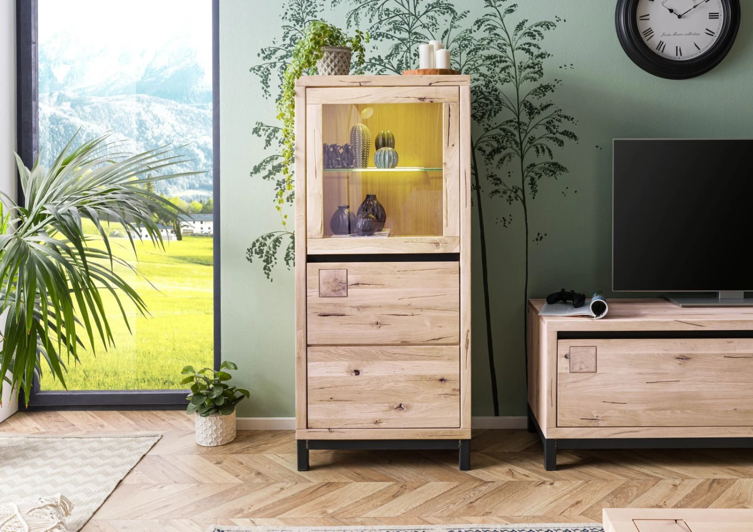 Mobile vetrina in legno massello di quercia selvatica, estetica minimale e contemporanea, superficie oliata per massima durata del manufatto, autentiche sfumature e discromie dalleffetto grezzo. Perfetto in cucina come credenza, funziona benissimo anche nella zona living, specialmente se abbinato ad altri arredi della stessa collezione. Il mobile vetrina in legno massello dispone di due sezioni di contenimento, entrambe con sistemi di apertura a gola. Quella inferiore presenta una singola anta cieca con incisione nel mezzo della facciata, il che dà lillusione di due sportelli separati. Allinterno due vani divisi da un ripiano orizzontale. In alto una porticina a vetro rivela due scomparti e un ripiano dello stesso materiale. Base e pannello di raccordo interno sono in metallo satinato grigio.