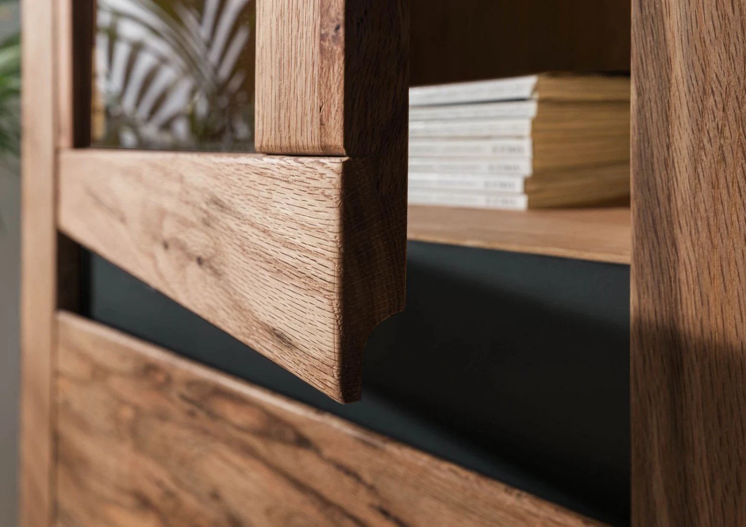 Questa vetrina della serie MONTREUX colpisce per il suo interessante abbinamento di materiali. L’aspetto unico del legno massiccio di quercia e cerro è particolarmente suggestivo. Il mobile è trattato con una finitura a olio nel colore Marrone Tabacco, che fa risaltare ancora meglio le particolari nodosità e fessure del legno. Questa finitura preserva le proprietà naturali del legno e gli permette di continuare a respirare.