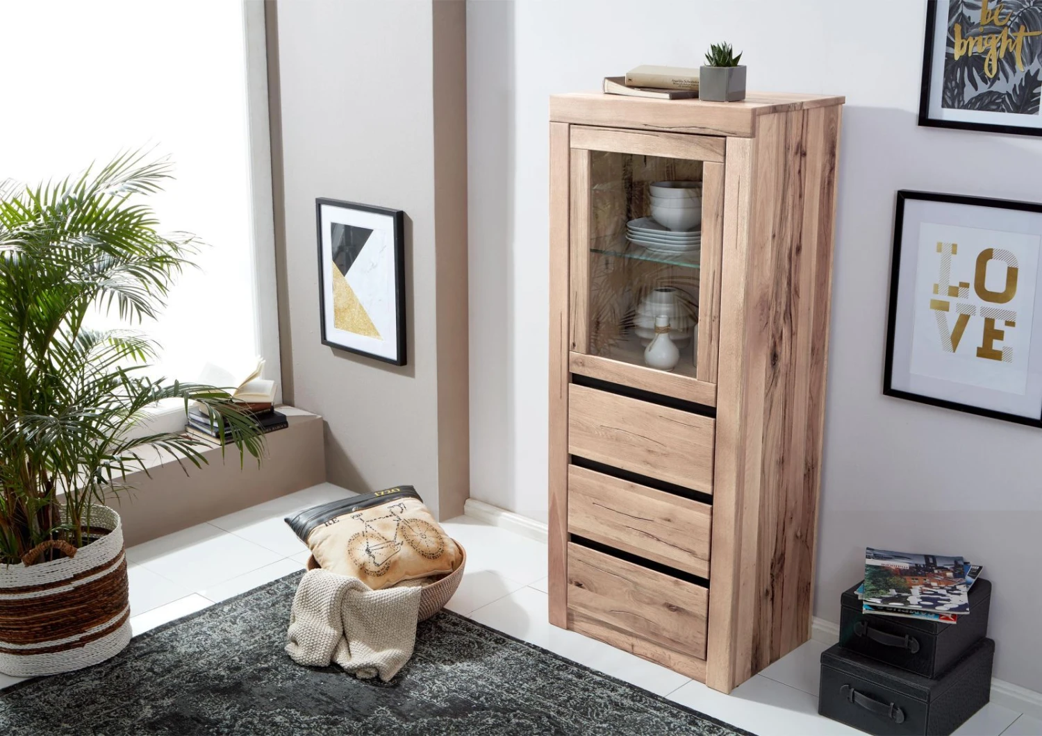 Mobile vetrina in legno massello di cerro, color bianco, nuance naturali e superficie ad effetto oliato. Tre spaziosi cassetti nella sezione inferiore e un pratico vano con due scomparti nella parte superiore. Questultimo è a vista grazie allanta in vetro che richiama lo stesso materiale di cui sono fatti i ripiani interni. Il mobile vetrina in legno massello di cerro è un riuscito mix di rustico e moderno, disponibile anche in bianco, sabbia/ocra. Al posto delle maniglie sono state ricavate aperture a gola mentre i sistemi guida come cerniere e carrelli sono progettati con meccanismo soft-close per uno scorrimento fluido e silenzioso.