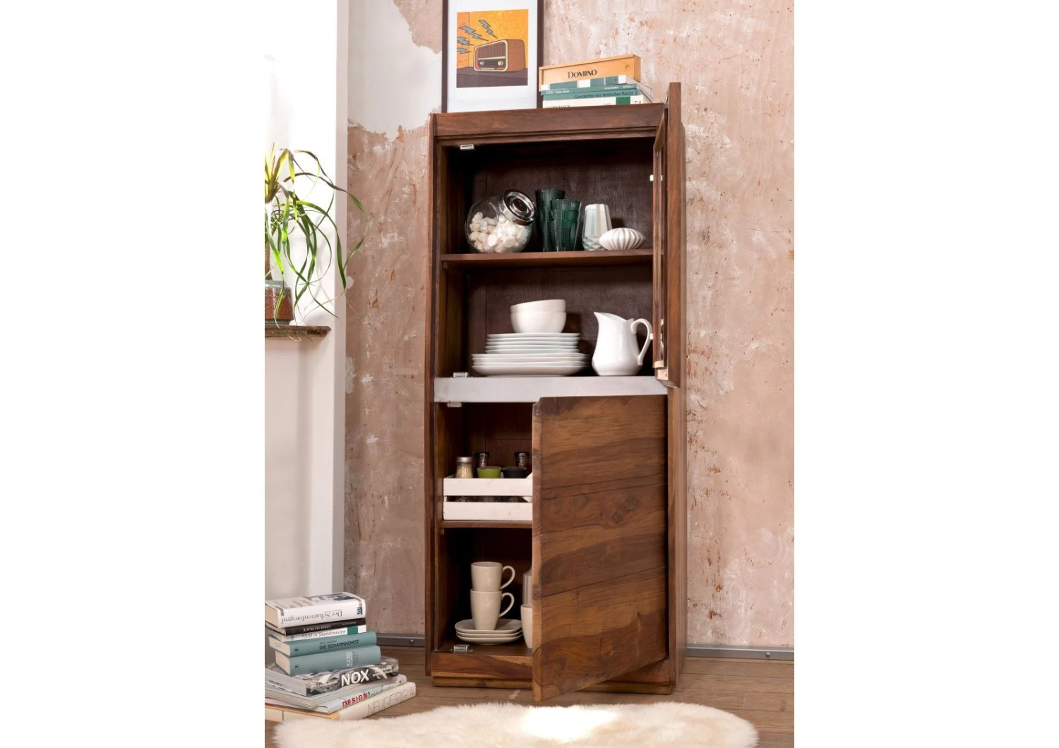La collezione Sydney è una vera cornucopia di idee per arredare la casa con un sapore moderno e un retrogusto vintage. Questa graziosa vetrinetta in legno massello di palissandro ne è la prova concreta. Un totale di 4 mensole di archiviazione sono disposte sui due livelli delle rispettive sezioni. Quella inferiore è racchiusa dietro un grande sportello con apertura a gola. Quella superiore ospita la cornice trasparente che è il tratto distintivo di questo mobile. Molto suggestivo anche il particolare colore marrone laccato con riflessi nocciola e miele. La vetrinetta in legno massello risulta efficace in soggiorno come in cucina, ed aggiunge un tocco di brio e di luminosità a qualunque stanza.